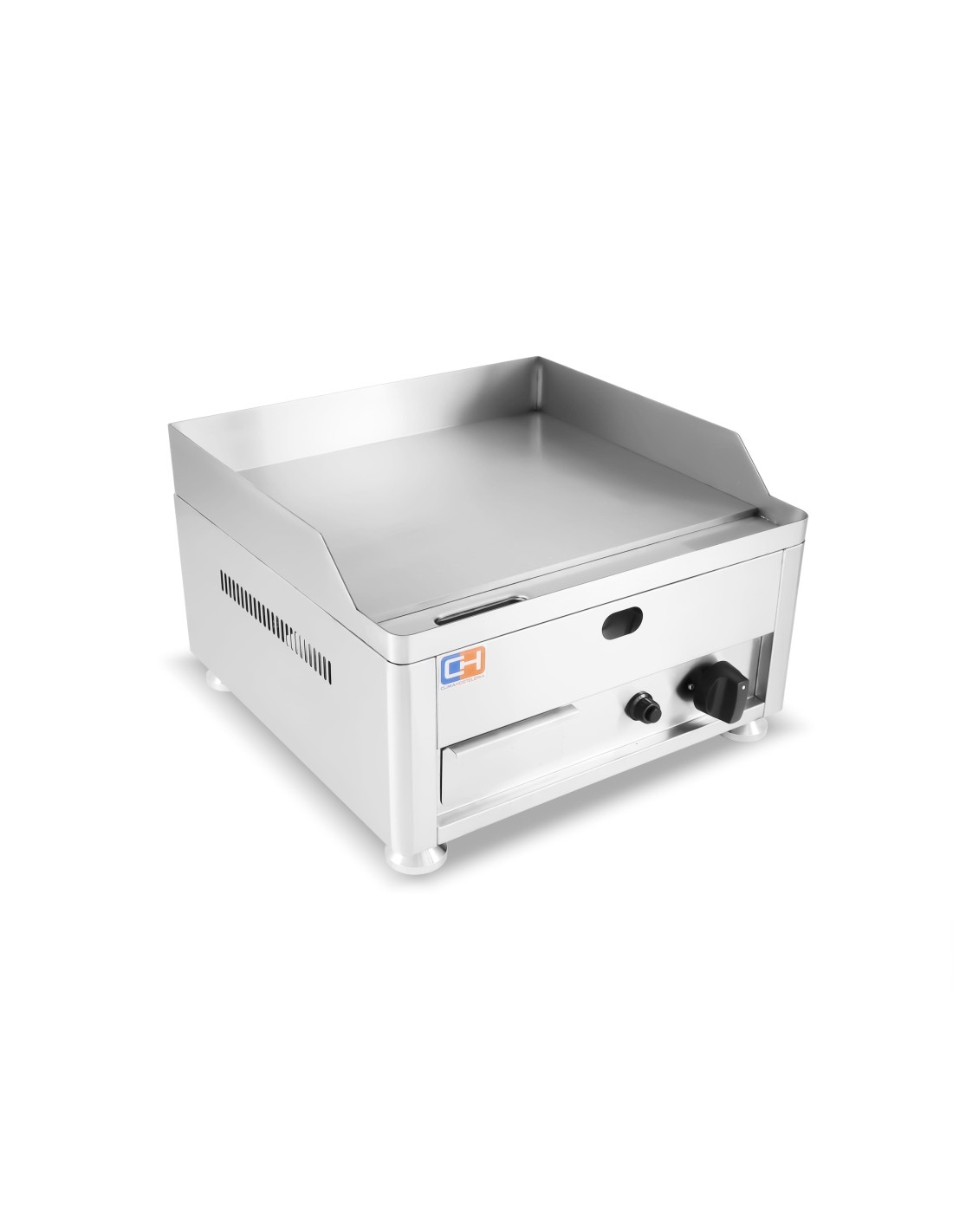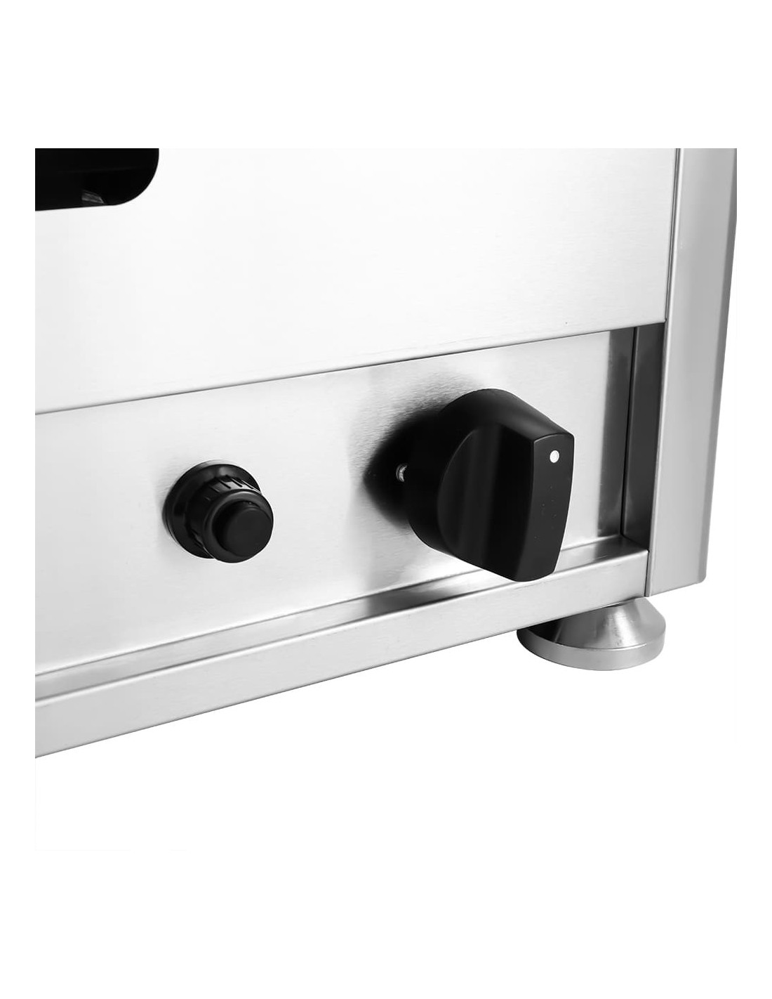 Fry Top a gas de sobremesa de Cromo Duro. La válvula de gas dispone de un control de llama alta/baja y dispositivo de seguridad anti fallo de llama. También dispone de cajón recogegrasas