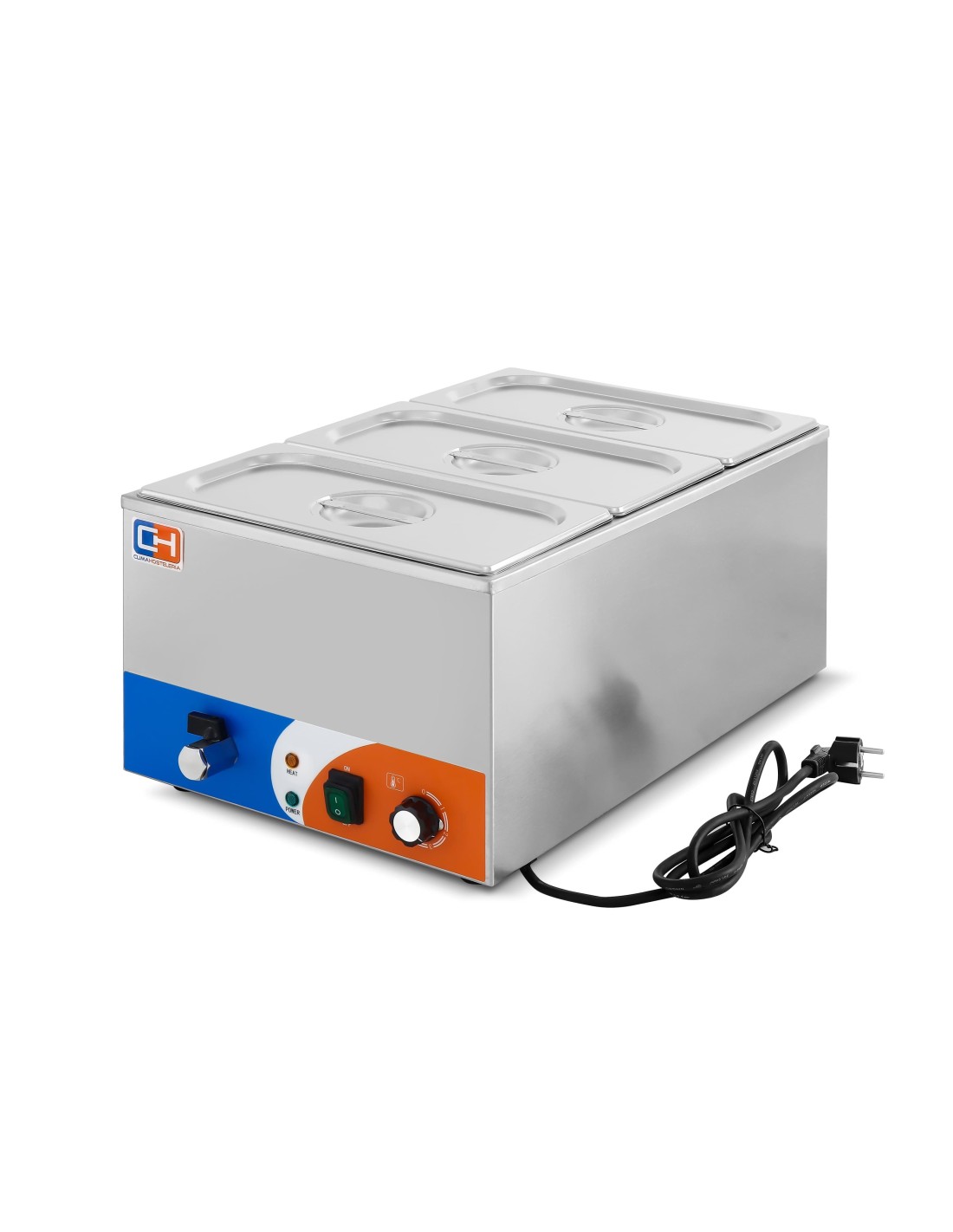 • Es un aparato eléctrico que calienta un baño de agua en el que se introducen las bandejas GN con los alimentos. El agua se emplea pues como trasmisor del calor y se mantiene por debajo del punto de ebullición a una temperatura máxima constante de 95°C, de manera que los alimentos conserven su textura y sabor.