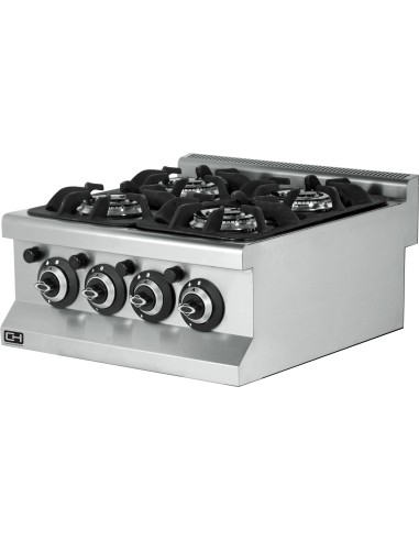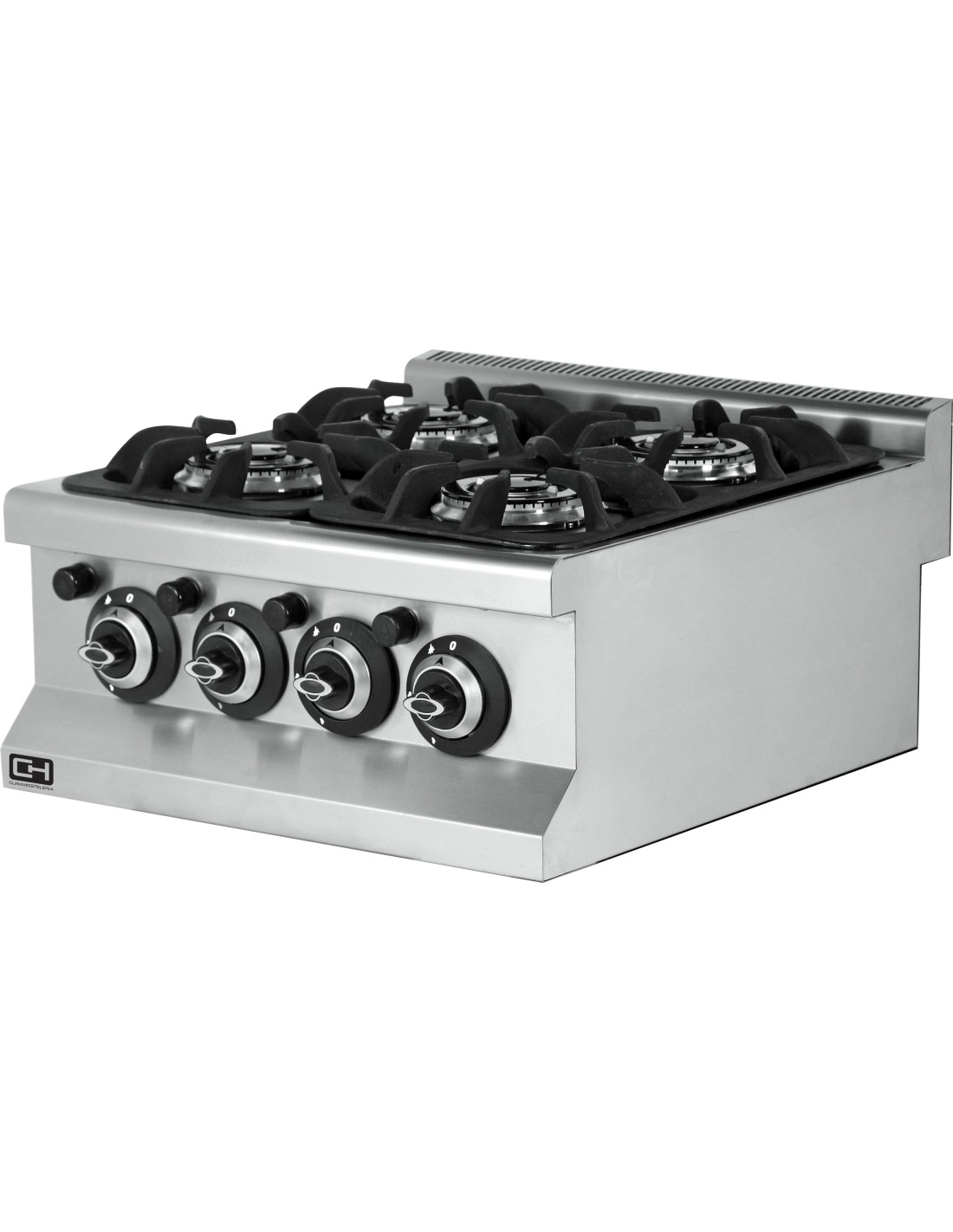 Cocina a gas de sobremesa fabricada en acero inoxidable con parrillas de hierro fundido y quemador con válvula de seguridad termopar. Vienen preparados para GAS BUTTANO-PROPANO y se proporcionan inyectores para gas natural