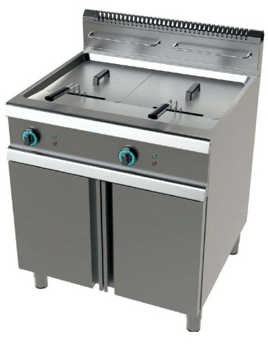 Freidora a gas de 2 cubas con soporte fabricada en acero inoxidable.Con válvula termostática de 90 a 185ºC .Equipado con grifo de vaciado de aceite.