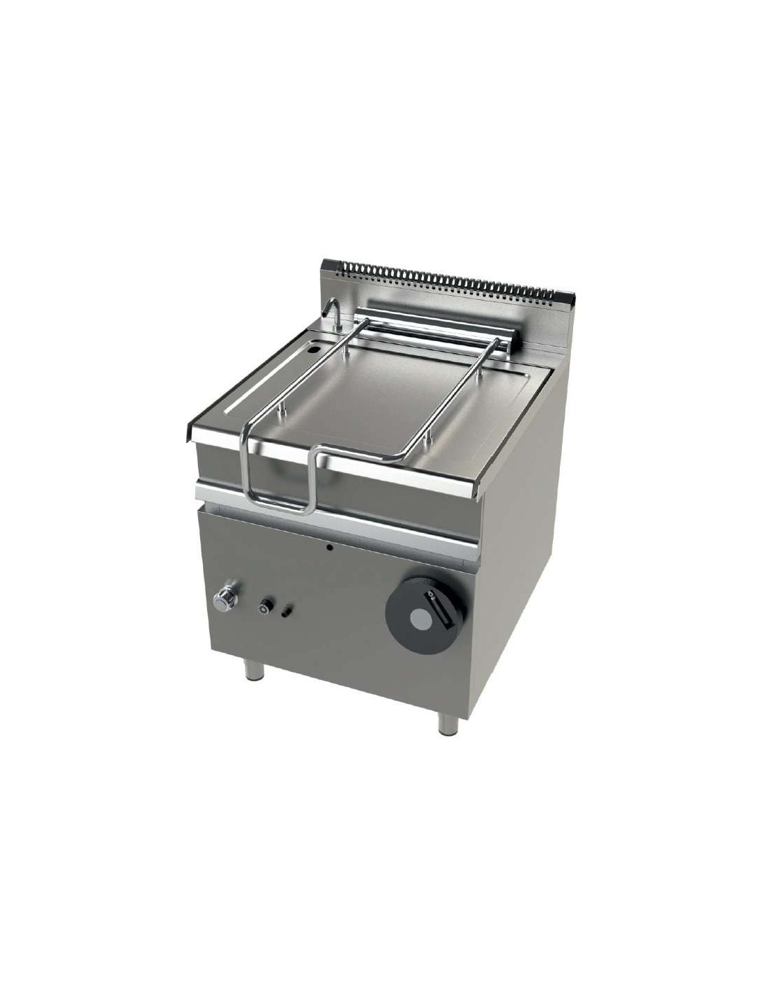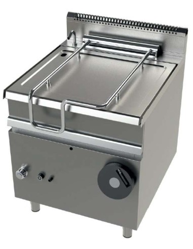 Sartén basculante a gas que permite asar, freír, estofar y hervir grandes cantidades de comida, equipada con un quemador tubular de alto rendimiento resistente a choque térmico y mecánico con válvula de seguridad y piloto con mecanismo de inclinación de ciba manual.