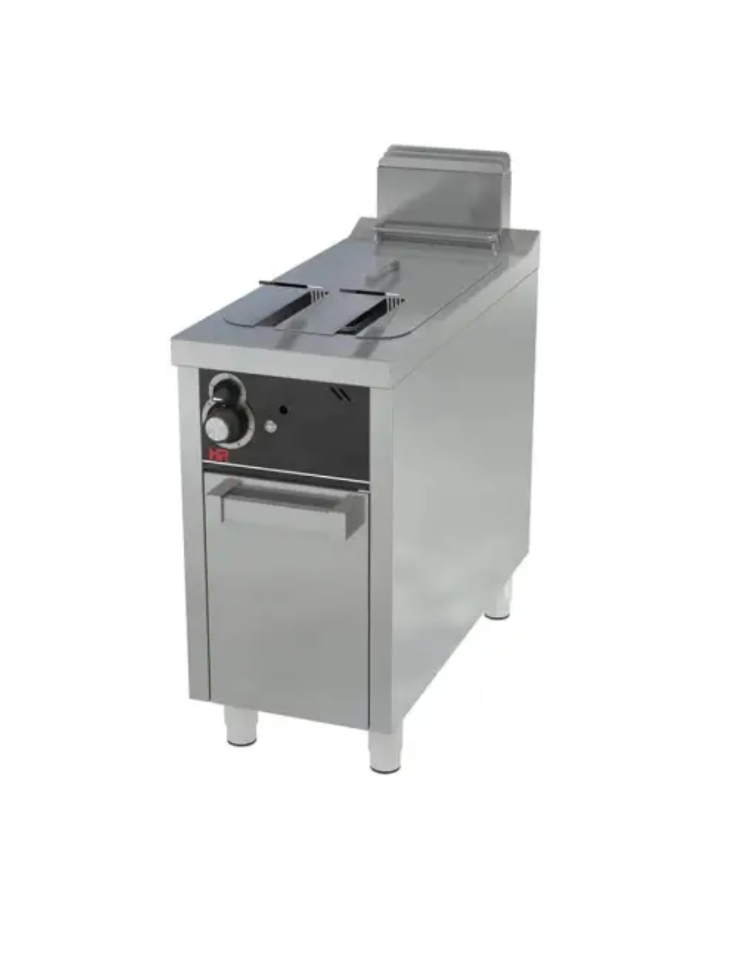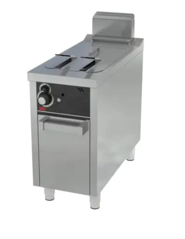 Freidora en acero inoxidable AISI 304. Encendido eléctrico y llama piloto protegida. Las cestas son de máxima calidad. Patas de acero inoxidable regulables en altura. Regulación de temperatura de 110ºC a 190ºC. Cubas de acero inoxidable AISI 304 con zona fría. Alta eficiencia energética, calentamiento mediante tubos transmisores en el interior de la cuba. Termostato de seguridad de 230ºC contra temperaturas excesivas del aceite. Incorpora filtro de recuperación de aceite. Incluye puertas de serie. Encimera embutida de acero inoxidable AISI 304 espesor 1,5mm. Grifo de vaciado.