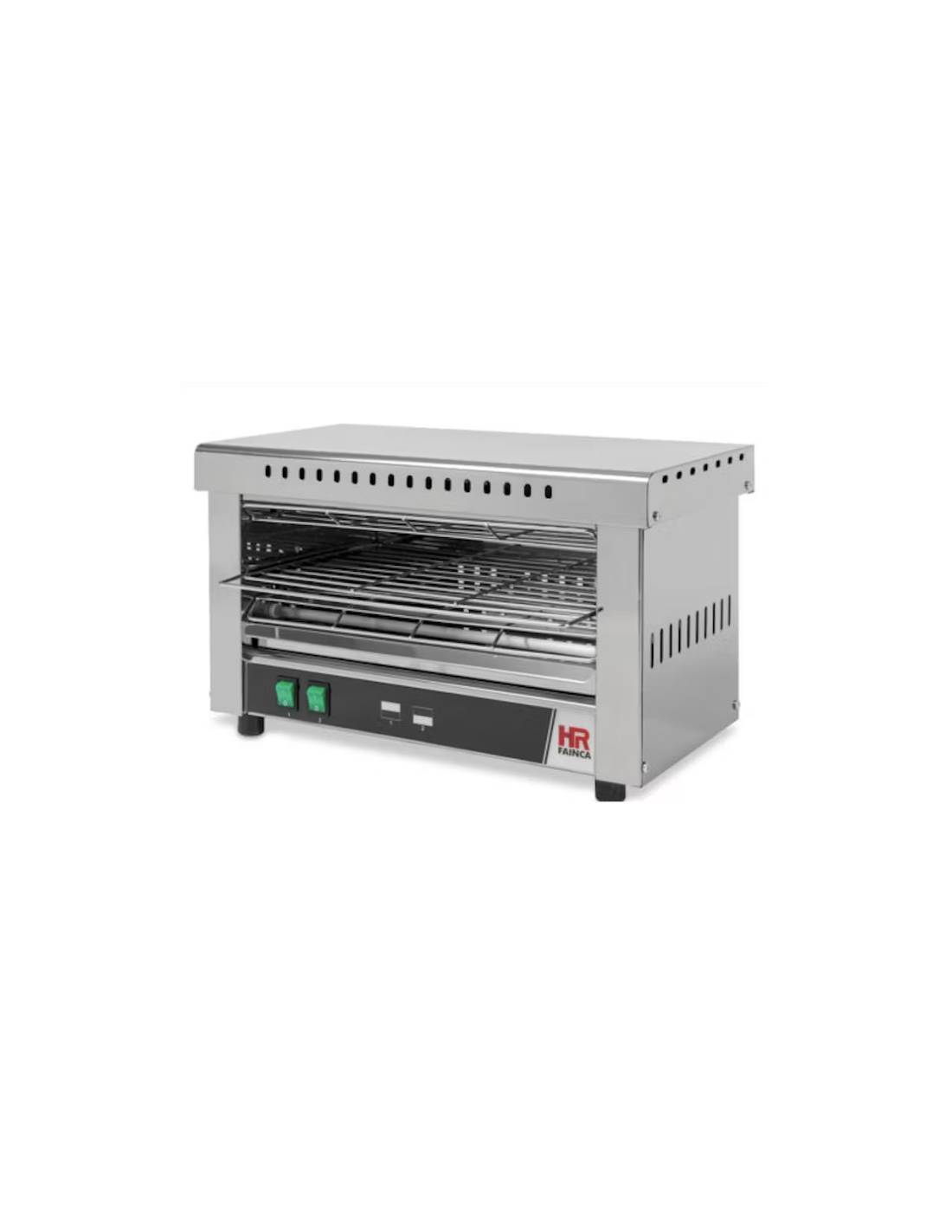 El tostador HR T03SIN es un equipo profesional ideal para hostelería y cocinas que demanda rendimiento constante. Fabricado en acero inoxidable AISI 304, cuenta con resistencias de cuarzo, doble piso, parrillas extraíbles y bandeja de migas desmontable. Su potencia de 2,4 kW y dimensiones compactas lo hacen perfecto para tostar pan de forma eficiente.