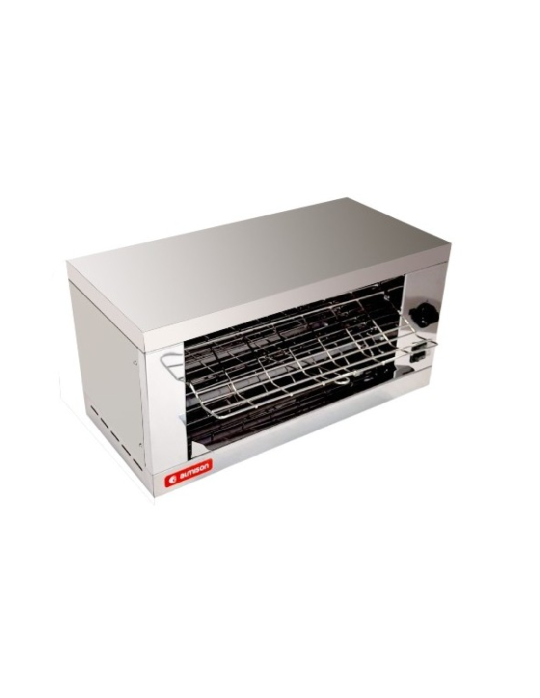Tostador eléctrico de gran capacidad con resistencias de cuarzo y parrillas extraíbles. Con interruptores luminosos para funcionamiento de resistencias por niveles.