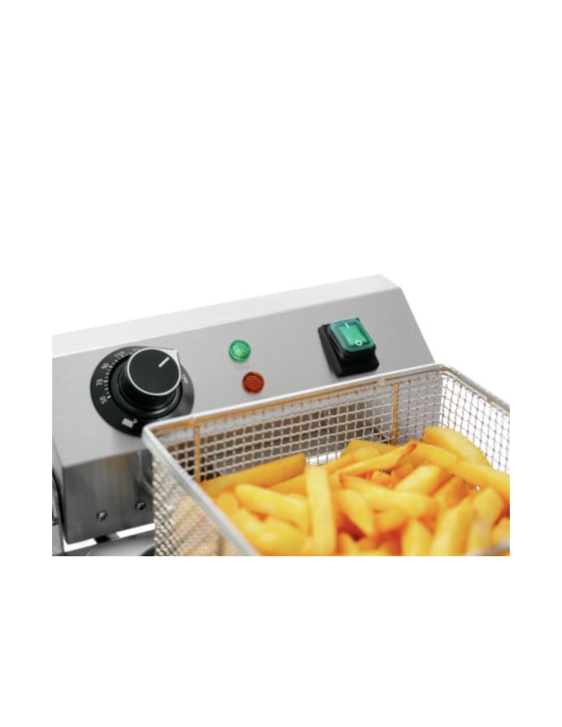 Construida en acero inoxidable de alta resistencia, con diseño robusto y fácil de mantener. Equipada con dos cubas de gran capacidad (12 L cada una) y cestas de 6,5 L, lo que permite freír grandes cantidades de producto simultáneamente.