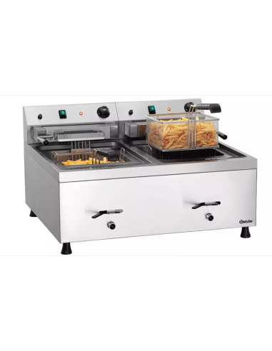 Freidora eléctrica de sobremesa con dos cubas de 12 litros cada una, ideal para un uso profesional intensivo. Ofrece gran capacidad, resistencia de acero inoxidable giratoria, zona fría para alargar la vida del aceite y grifo de vaciado para una limpieza más cómoda.
