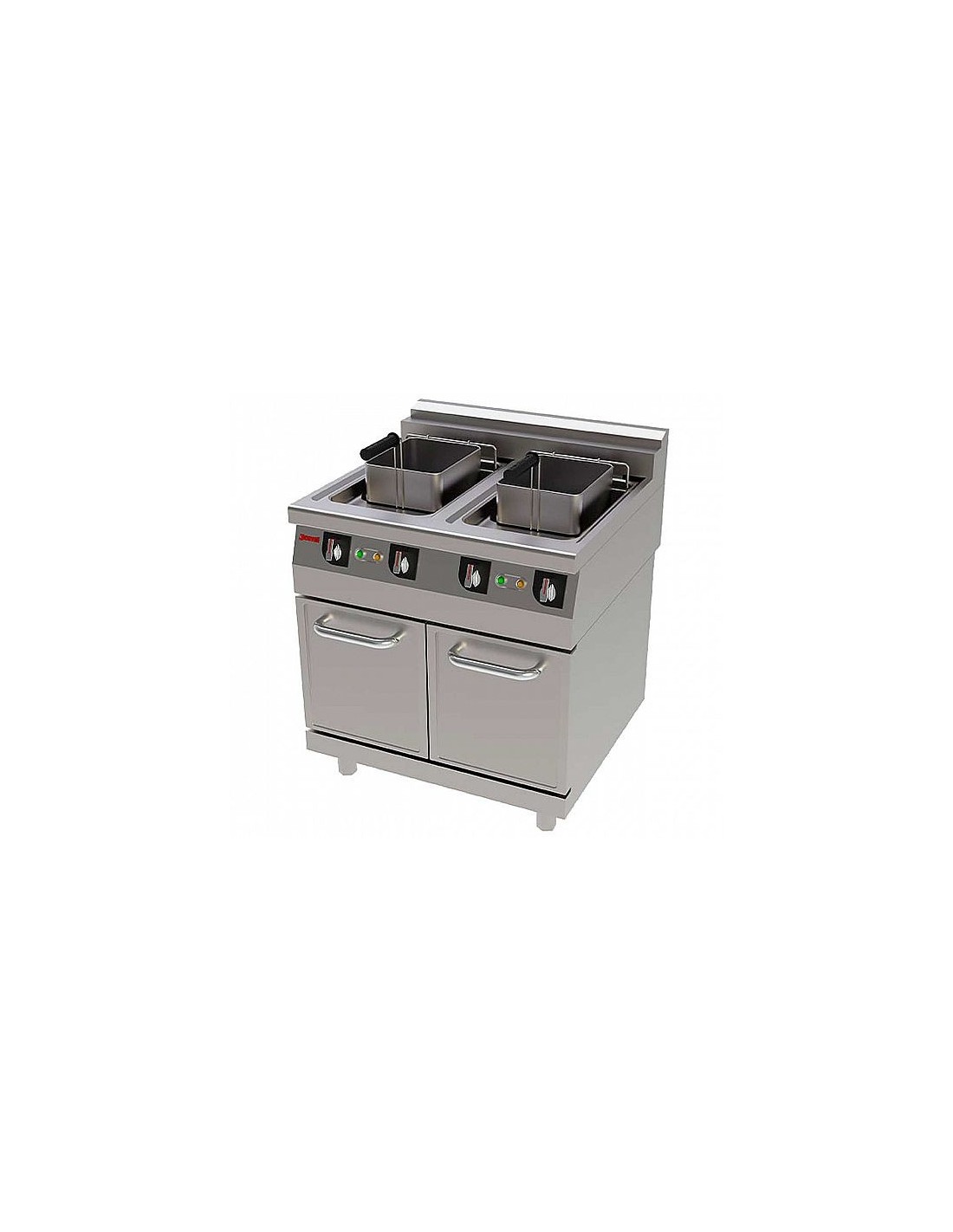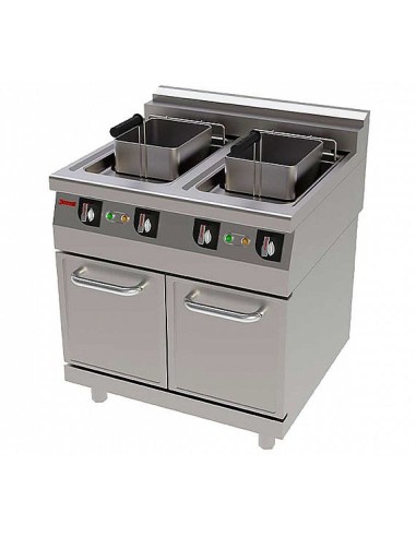 Freidora eléctrica profesional de doble cuba con control electrónico de temperatura, vaciado frontal y cestas con empuñadura térmica. Ofrece una rápida recuperación del calor, gran precisión y limpieza sencilla, ideal para cocinas de alto rendimiento en hostelería.