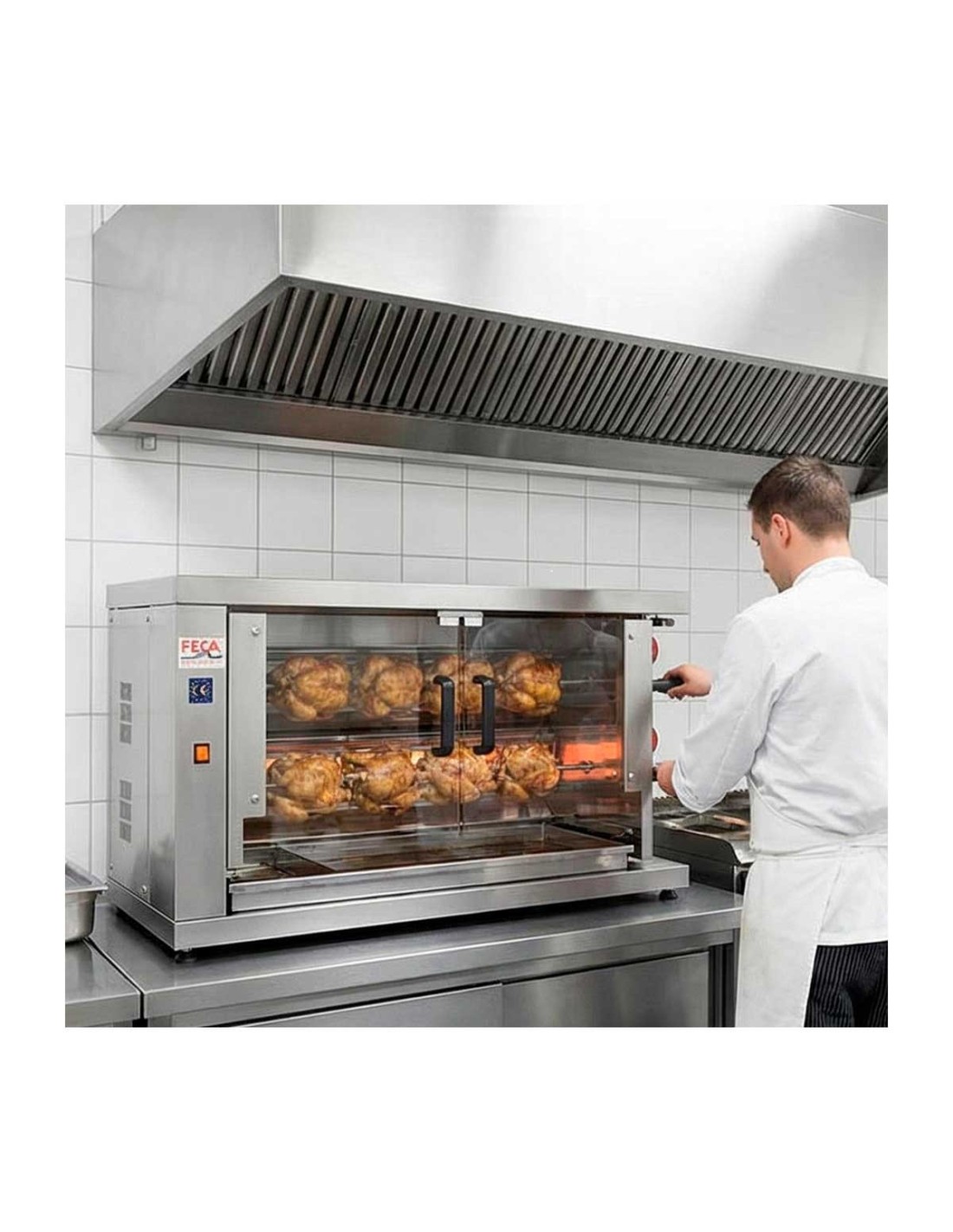 El Asador de Pollos 210 EKO de Feca es un equipo profesional a gas compacto y eficiente, diseñado para ofrecer fiabilidad y una cocción homogénea en establecimientos con producción baja o media. Incorpora un quemador de gas de altas prestaciones que asegura resultados constantes con un consumo optimizado.