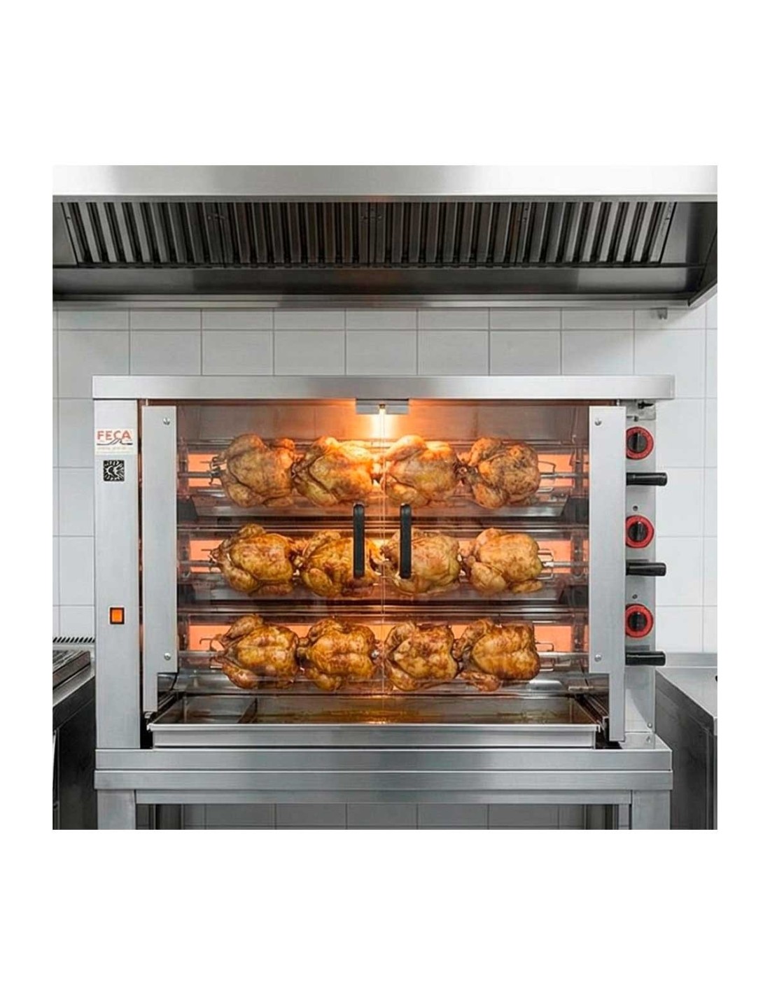 Asador de pollos a gas Feca 315 EKO con 3 espadas y capacidad aproximada de 15 a 18 pollos. Equipado con quemador de altas prestaciones y transmisión metálica por cadena, ideal para asado uniforme en hostelería profesional.