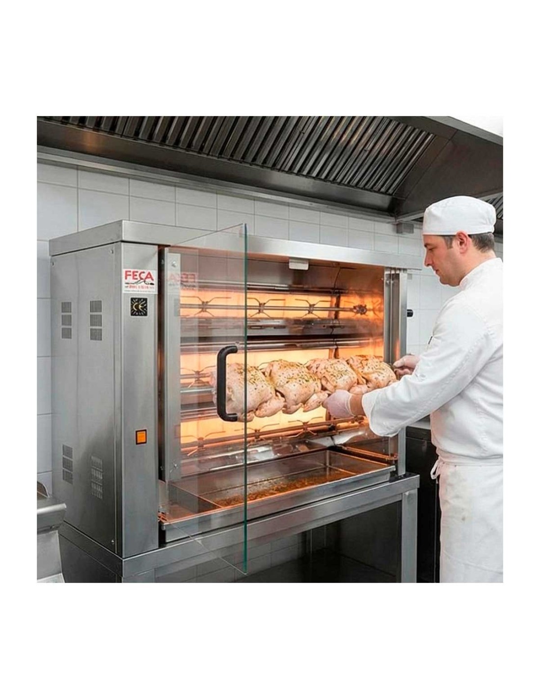 El Asador de Pollos 315 EKO de Feca es un equipo profesional a gas que destaca por su fiabilidad, simplicidad mecánica y alto rendimiento. Diseñado para un uso intensivo, incorpora un quemador de gas de altas prestaciones que garantiza una cocción homogénea y eficiente, ideal para establecimientos de hostelería que buscan resultados constantes con un mantenimiento mínimo.