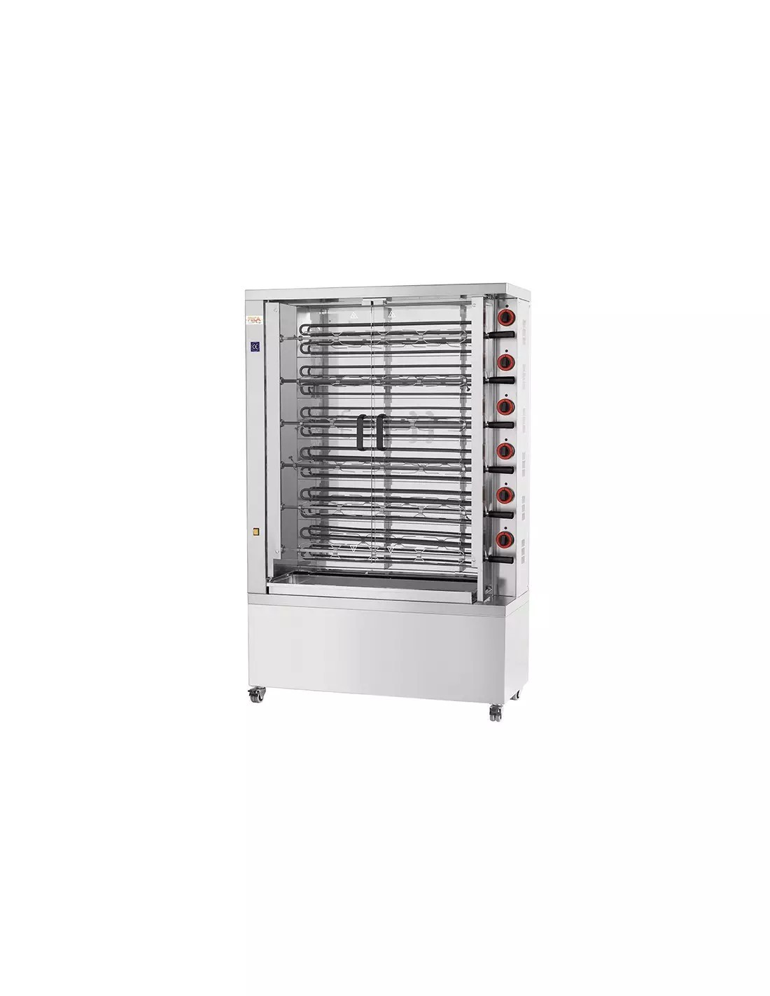 Gracias a sus dimensiones —1100 × 450 × 1760 mm— este modelo se integra fácilmente en cocinas profesionales, zonas de venta directa o líneas de exposición. Es ideal para panaderías-asador, puntos de venta de pollo asado, food-trucks y tiendas especializadas que necesitan un equipo fiable, productivo y con buena visibilidad del producto.