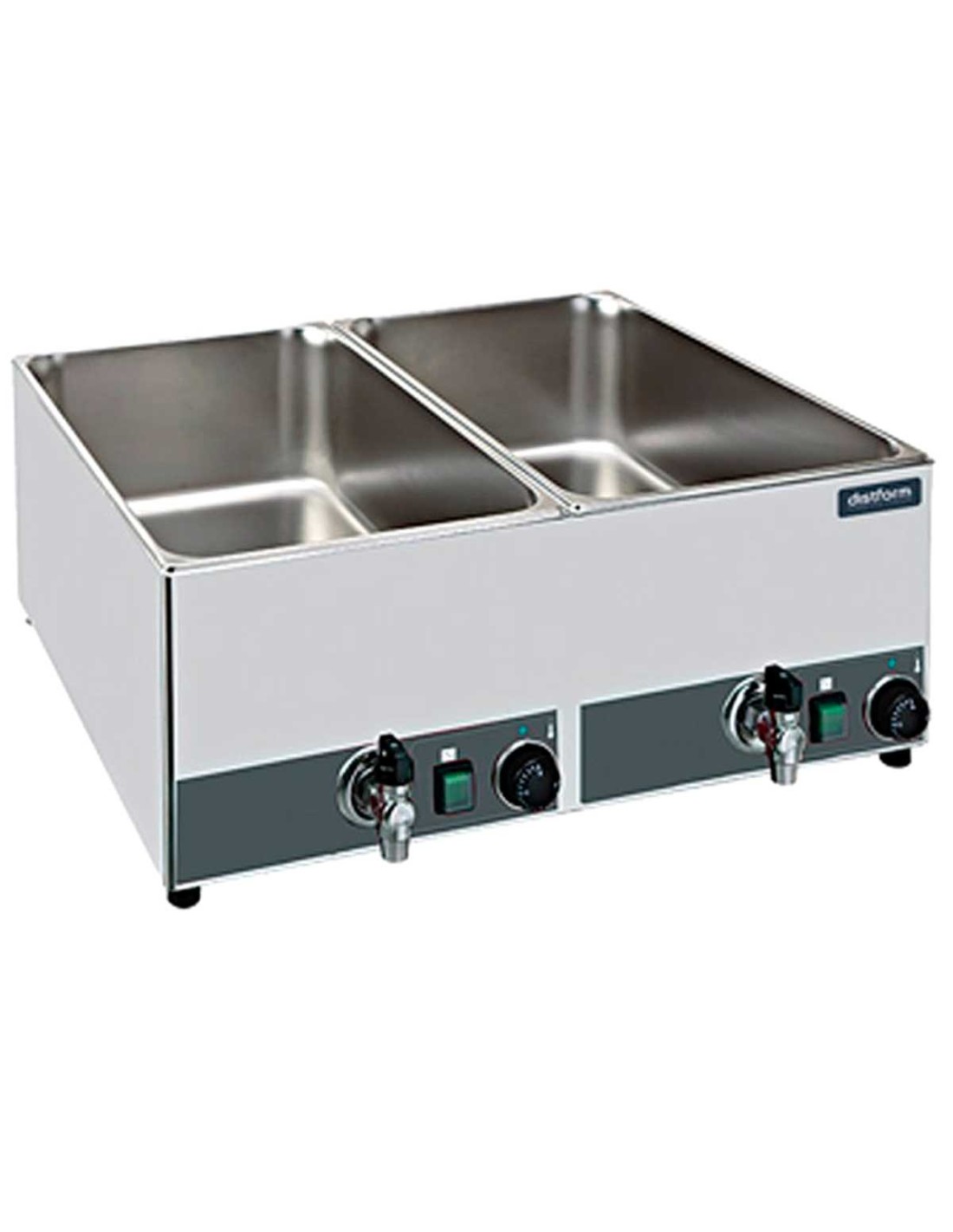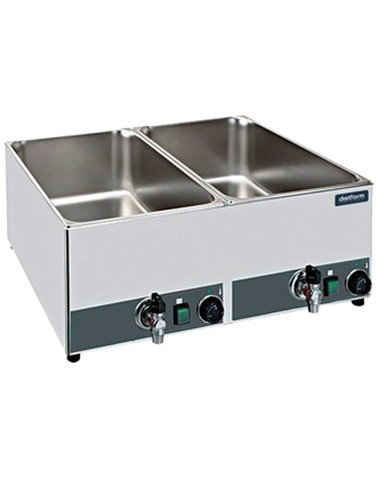Baño María de Sobremesa Distform en acero inoxidable AISI-304, con 1 o 2 cubas GN 1/1, potencia de 600–1200 W y termostato digital 0–90 ºC. Incluye grifo de desagüe y cuba embutida sanitaria. Perfecto para mantener alimentos calientes.