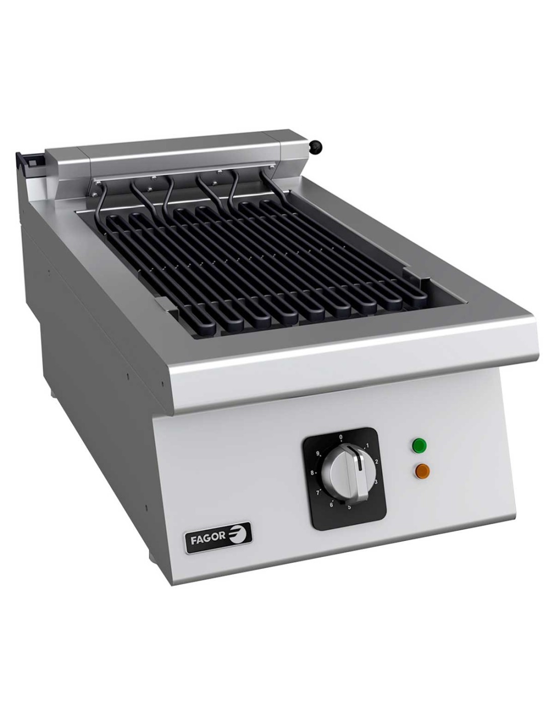 La barbacoa eléctrica sobremesa Fagor Kore 700 es una parrilla profesional diseñada para cocinas de alto rendimiento. Fabricada en acero inoxidable AISI 304, alcanza hasta 400 °C para un sellado perfecto y una cocción uniforme. Su diseño modular, protección IPX5 y sistema de recogida de grasas la convierten en una solución potente, segura y fácil de limpiar para hostelería profesional.