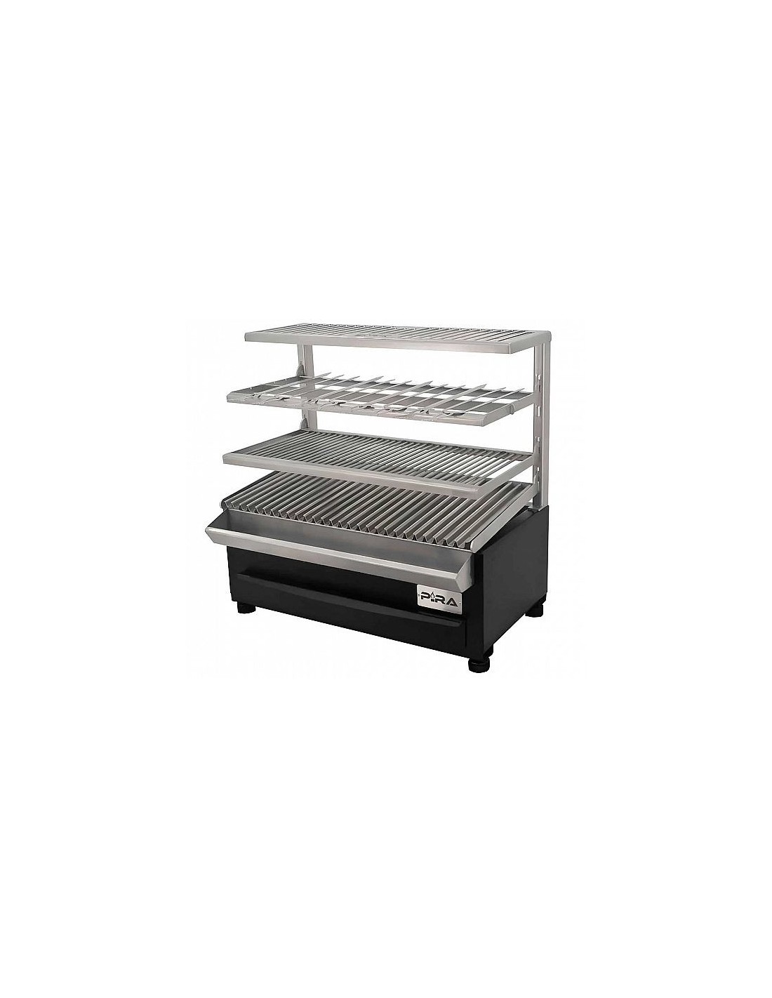 Dispone de una columna regulable en 5 posiciones, que permite ajustar la altura de las parrillas y controlar con precisión el braseado. El estante superior fijo funciona como calientaplatos, ideal para mantener las brochetas calientes o atemperar los alimentos antes de su cocción.