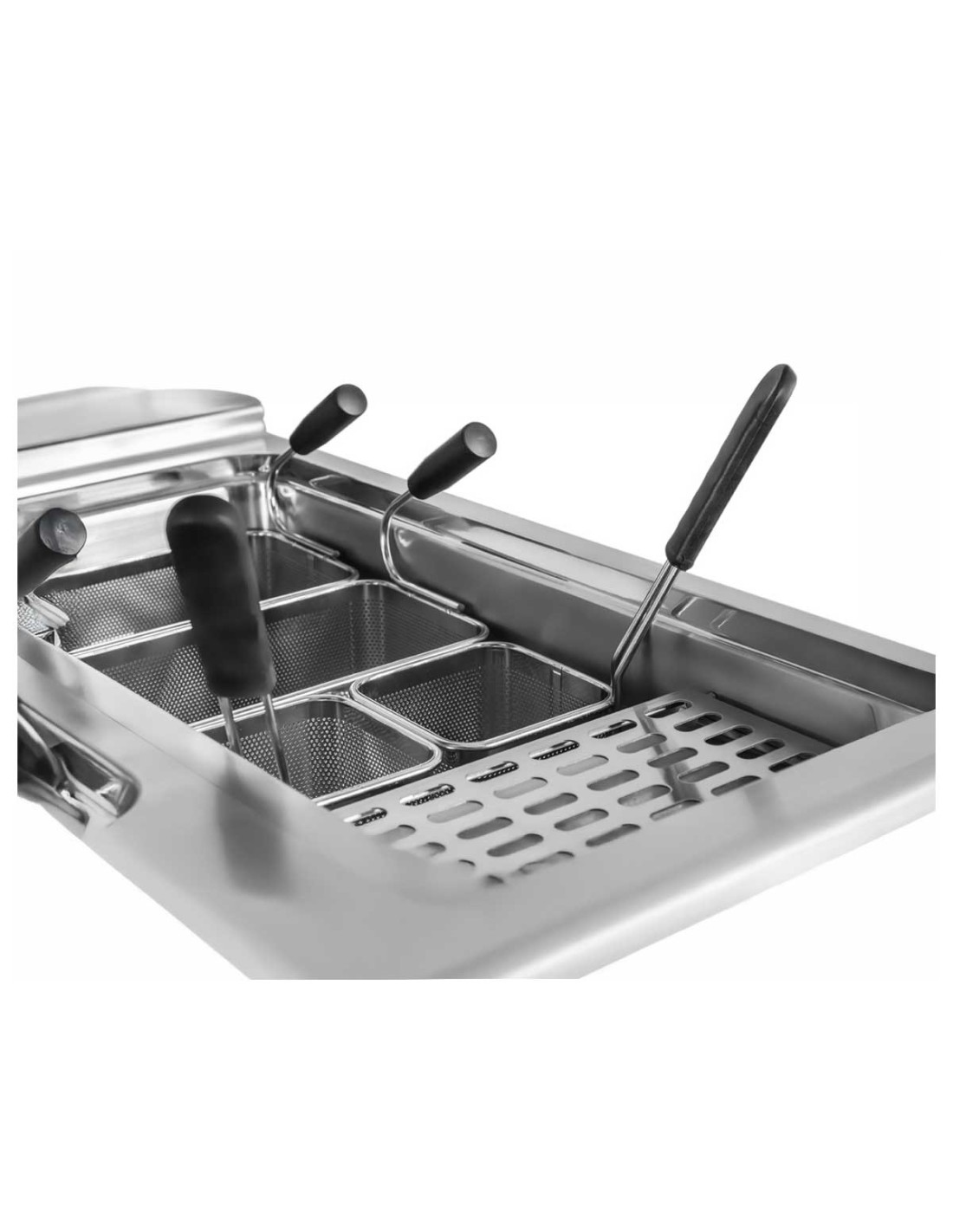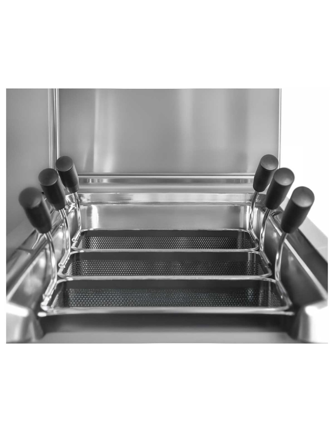 Este cuecepastas pertenece a la Serie 750 EV de Jemi y dispone de una cuba de 27 litros con 2 cestas de acero inoxidable, impulsado por un potente sistema eléctrico de 9 kW que garantiza una recuperación rápida de temperatura y una cocción homogénea.