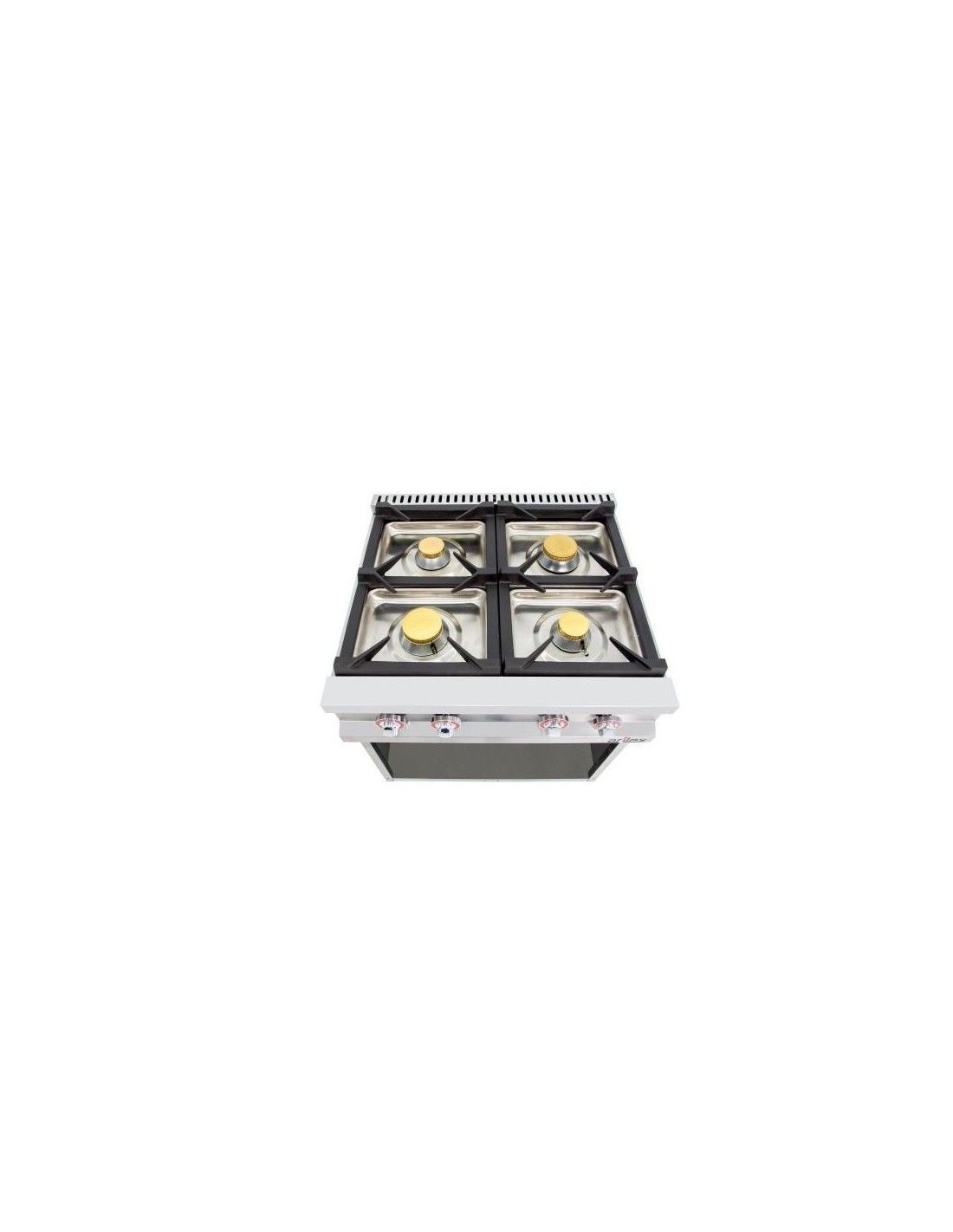 Esta cocina profesional incorpora fuegos superiores de hierro fundido y latón de alto poder calorífico, con válvula de seguridad por termopar y llama piloto protegida en cada quemador.