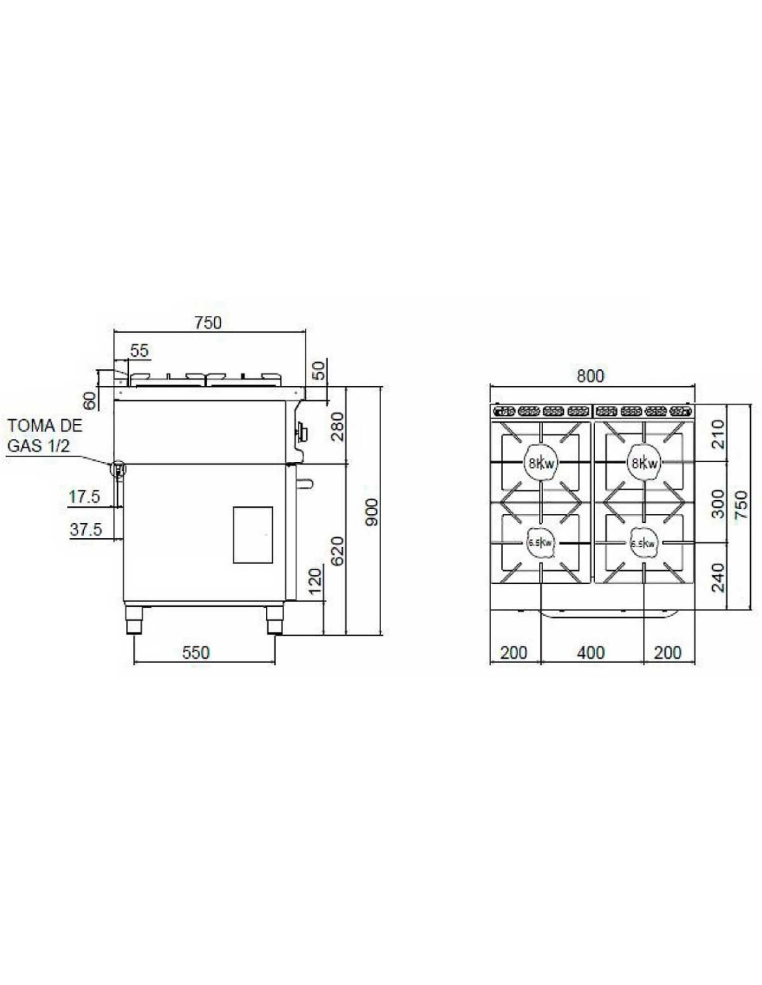 Potencia total de los quemadores: 2 x 6,5 kW + 2 x 8 kW (28 kW total).