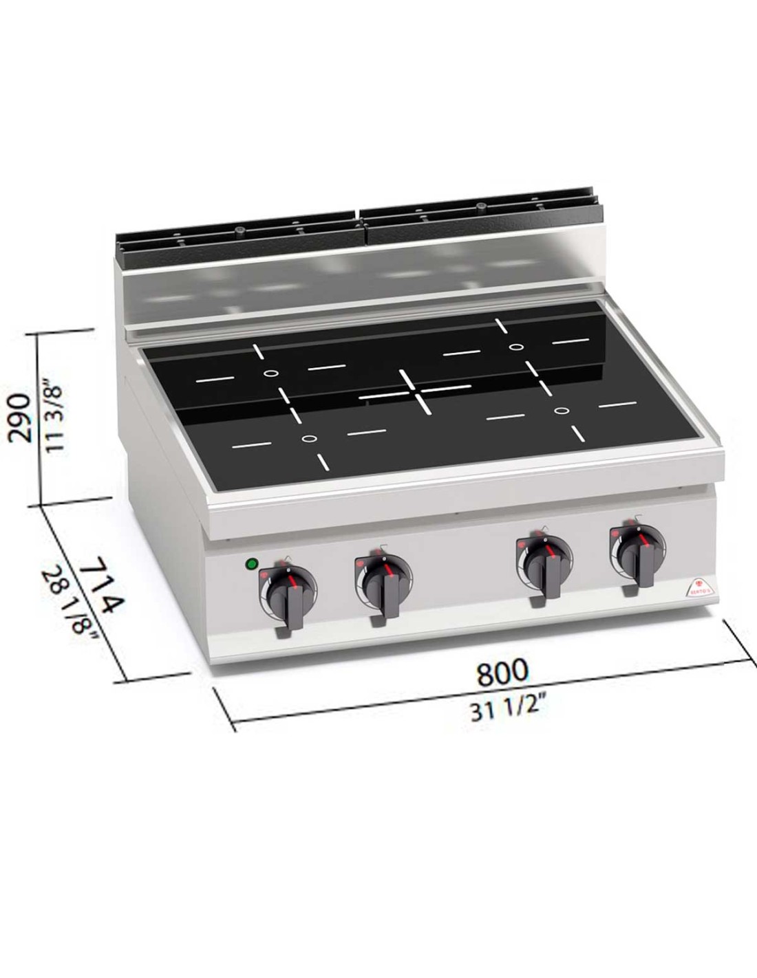 Cocina vitrocerámica de sobremesa Bertos Plus Macros 700 E7P4BVTR con 4 zonas de cocción y potencia total de 12,8 kW. Calentamiento por irradiación hasta 500 ºC, ideal para cocinas profesionales compactas que requieren precisión y alto rendimiento.