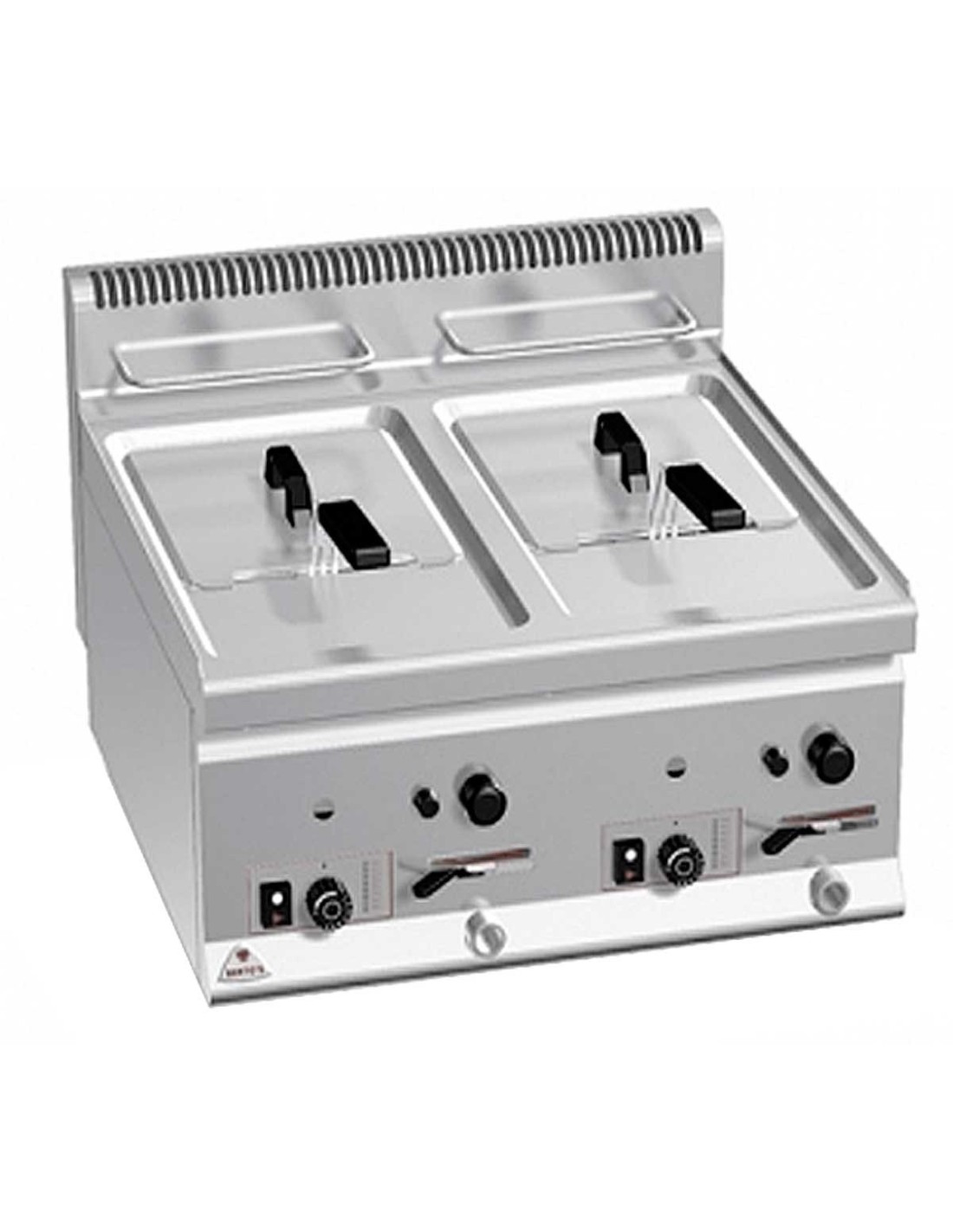 Freidora a gas doble de sobremesa con dos cubas de 8 litros cada una. Fabricada en acero inoxidable AISI 304, con quemadores tubulares, encendido piezoeléctrico y grifo de vaciado. Temperatura regulable de 110 a 190 ºC. Medidas: 60 × 60 × 29 cm.
