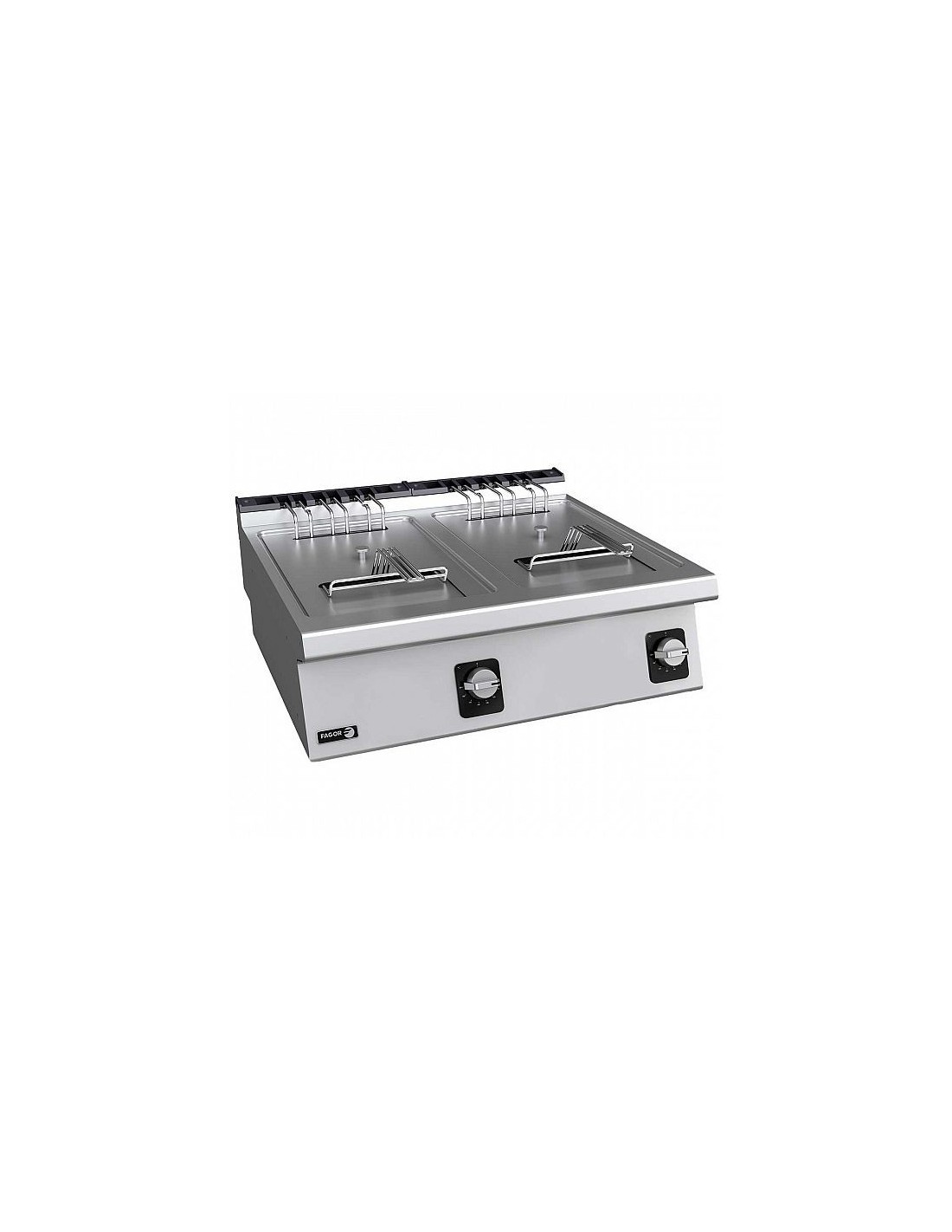 La Freidora Eléctrica Fagor Kore 700 F-E7208 es un equipo profesional de doble cuba con capacidad de 8+8 litros y una potencia total de 12 kW. Fabricada en acero inoxidable AISI-304, incorpora resistencias basculantes, zona fría, control termostático de 60-200 °C y grifo de vaciado de aceite. Ideal para líneas de fritura intensiva en cocinas profesionales que requieren velocidad, producción continua y fácil limpieza.