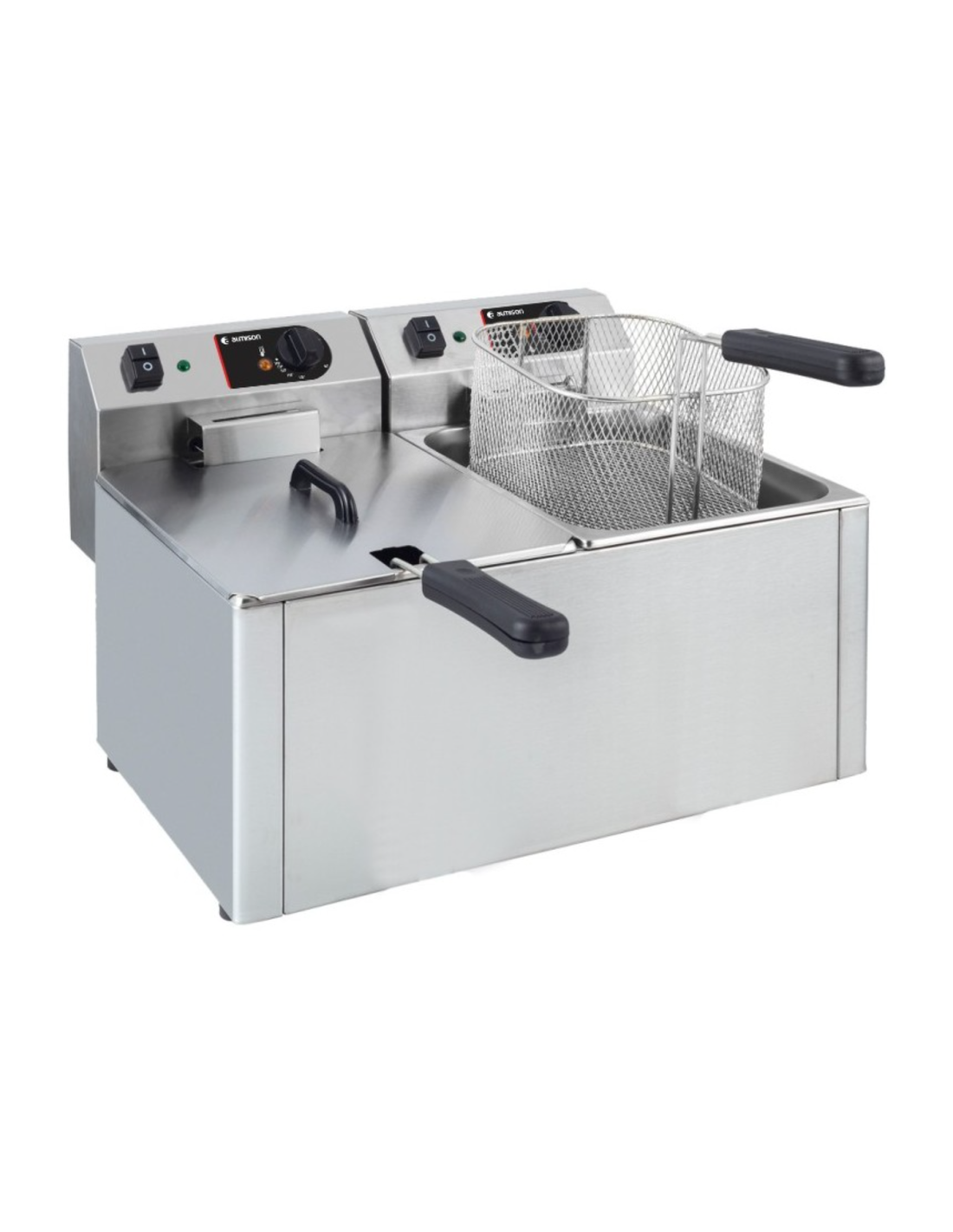 Freidora sobremesa eléctrica doble 7 + 7 litros sin grifo Almison, está fabricada en acero inoxidable y tiene termostato regulable a 190ºC y de seguridad a 240ºC.