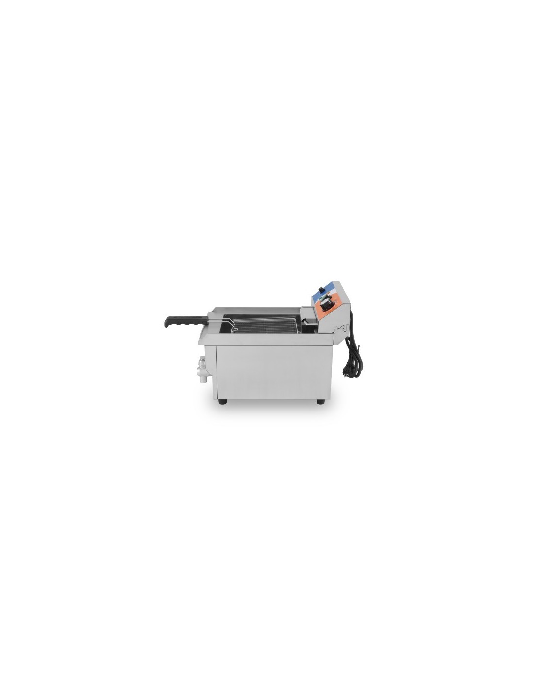 Freidora electrica de acero inoxidable con termostato de regulación de calor en la cuba hasta 190ºC y termostato de seguridad con rearme manual.