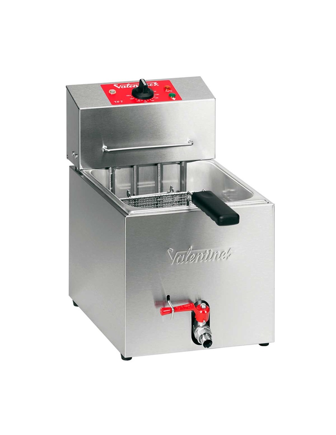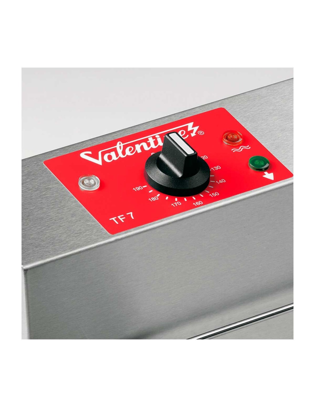 Freidora profesional de sobremesa Valentine TF-7 con cuba de 5,5 a 7 litros y sistema especial para productos congelados. Disponible en versión TF 7 (3,6 kW) y TF 7 Turbo (4,6 kW) para mayor productividad.