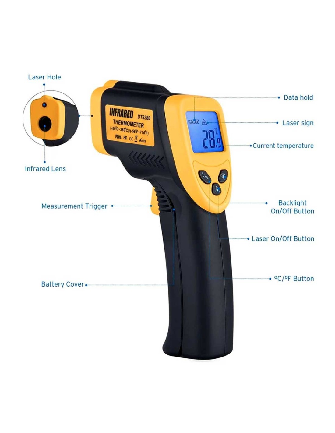 Un termómetro fiable y eficiente, ideal para el control rápido de temperaturas superficiales en alimentos, aceites y equipos, sin necesidad de contacto físico.
