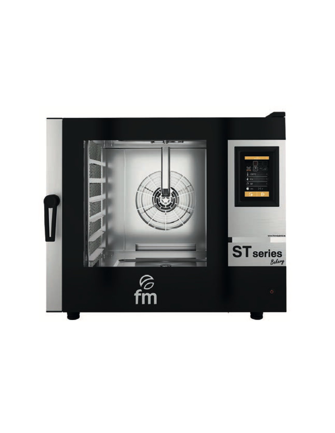 El Horno Eléctrico Bakery STB 5/86 V7 de FM es un horno profesional compacto, pensado para panaderías, pastelerías y obradores que necesitan precisión, versatilidad y alto rendimiento en espacios reducidos. Incorpora un panel de control digital con pantalla táctil de 7”, intuitivo y fácil de manejar, que permite controlar con exactitud todos los parámetros de cocción.