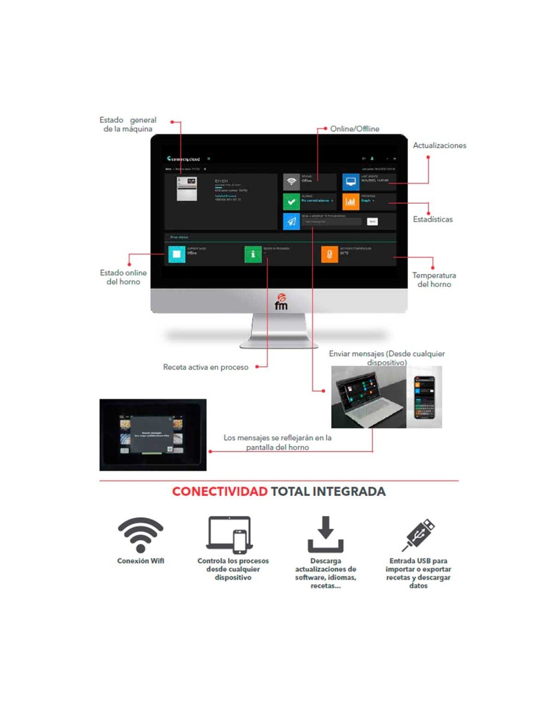Cocción combinada: convección + microondas + impigement, logrando tiempos de cocción muy inferiores a los hornos convencionales.