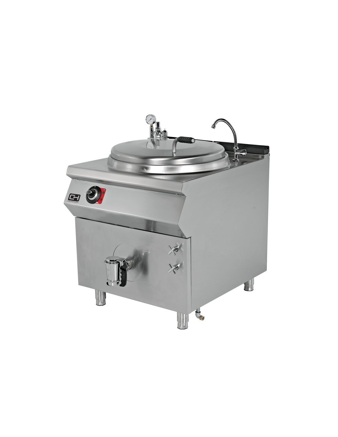 La marmita dispone de grifo de llenado de agua fría y caliente, válvula de drenaje, válvula de seguridad de sobrepresión con manómetro y tapa abatible con contrapeso, ofreciendo un manejo seguro, cómodo y adaptado al uso profesional continuo.