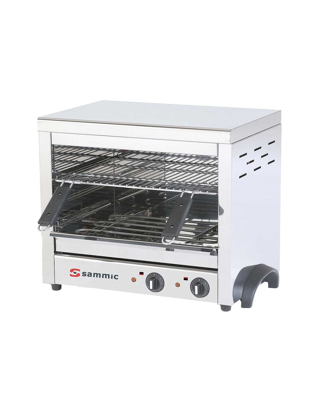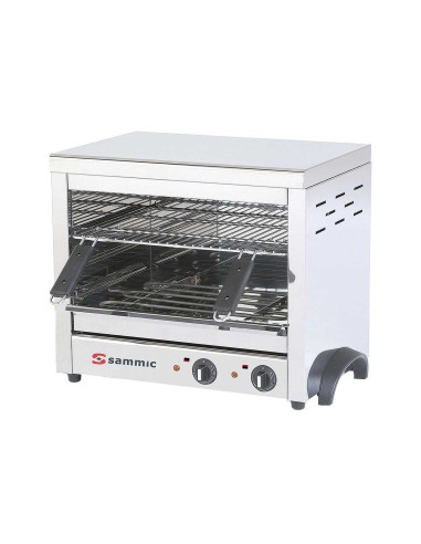 La Salamandra profesional Sammic SGF-450 con 3 posiciones, resistencias inox, bandeja recogegrasas y termostatos independientes. Modelos SGF-450 (3600 W, 45×35 cm) y SGF-650 (4700 W, 65×35 cm). Perfecta para gratinar y finalizar platos.