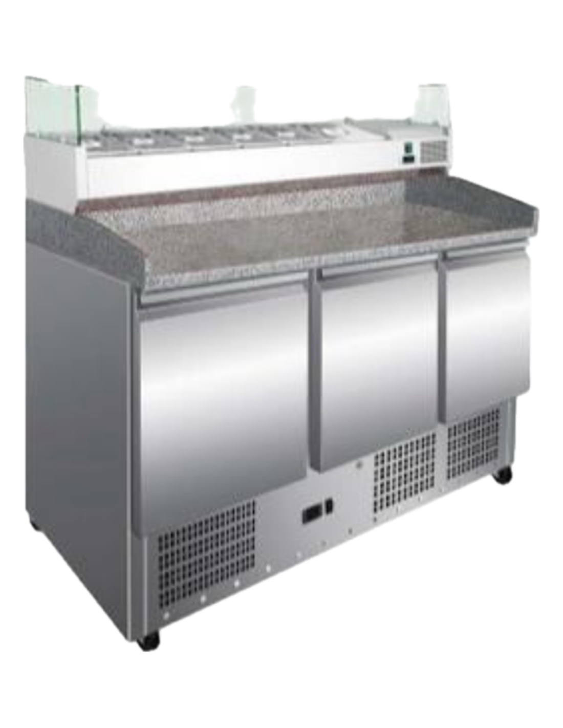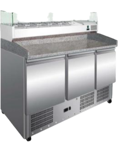 Mesa refrigerada de preparacion de Pizzas con encimera de granito preparado para introducir bandejas 600x400mm y con posibilidad de incorporar vitrina de ingredientes.Con termostato y desescarche automático ,Temperatura: +2 /+8 (ºC)