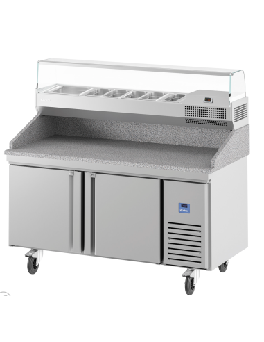 La mesa refrigerada Infrico MPG 1940 COMBO está fabricada en acero inoxidable AISI-304, con sistema de frío ventilado y refrigerante ecológico R-290.Tiene la encimera de granito y vitrina de ingredientes incluida. Lleva 4 ruedas para fácil desplazamiento, las 2 delanteras con freno.