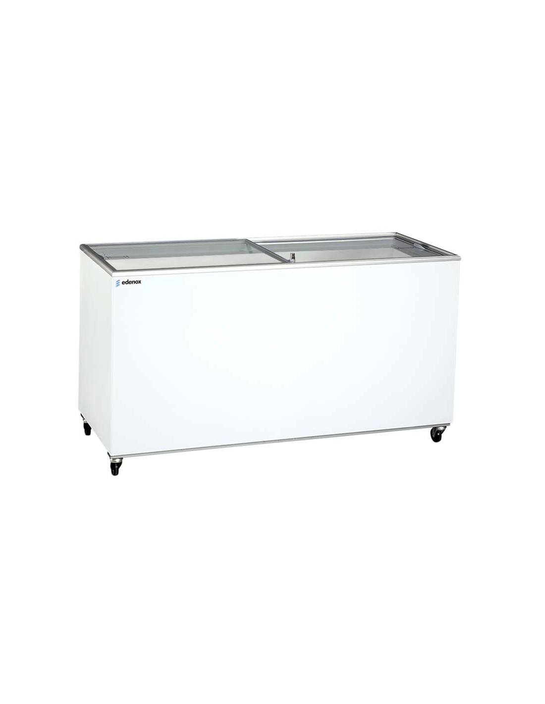 Arcón congelador Edenox NLFG-500 con puertas de cristal, 154,8×62,9×89,2 cm, 500 W de potencia y rango −12/−22 ºC. Aislamiento en poliuretano inyectado libre de CFC y refrigerante ecológico R290a. Ideal para negocios que requieren gran capacidad de almacenamiento congelado.