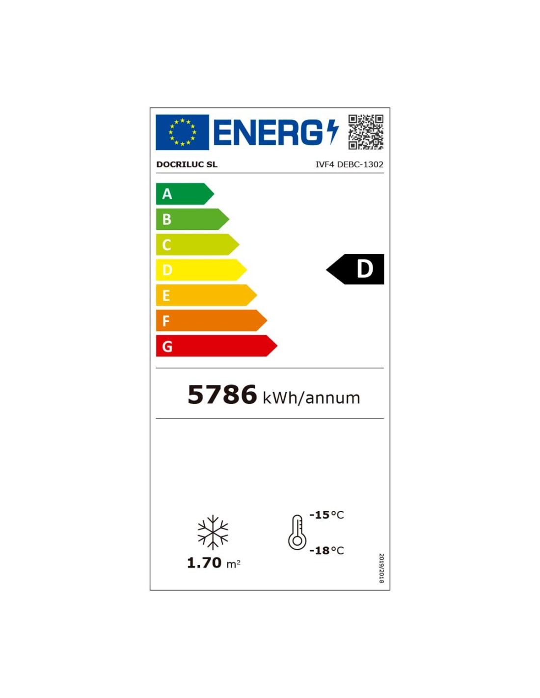 El congelador vertical DEBC-1302 dispone de etiqueta de eficiencia energética clase D, conforme al Reglamento UE 2019/2018.