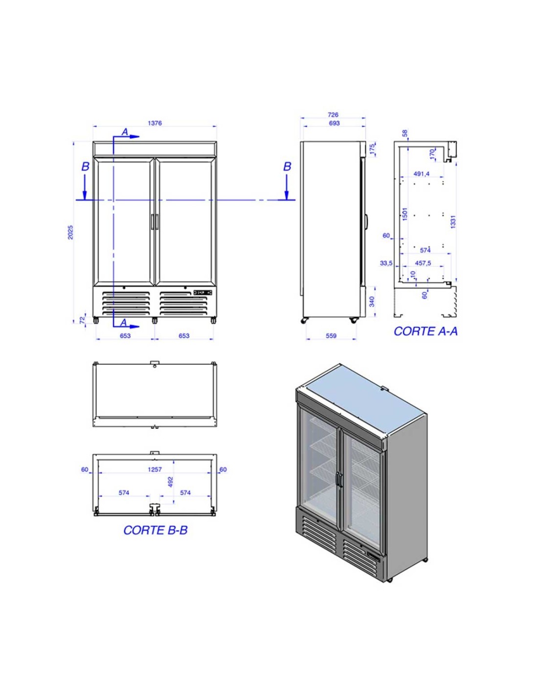 Puertas: 2 abatibles de doble cristal con tiradores integrados y marco calefactado para evitar la acumulación de hielo.