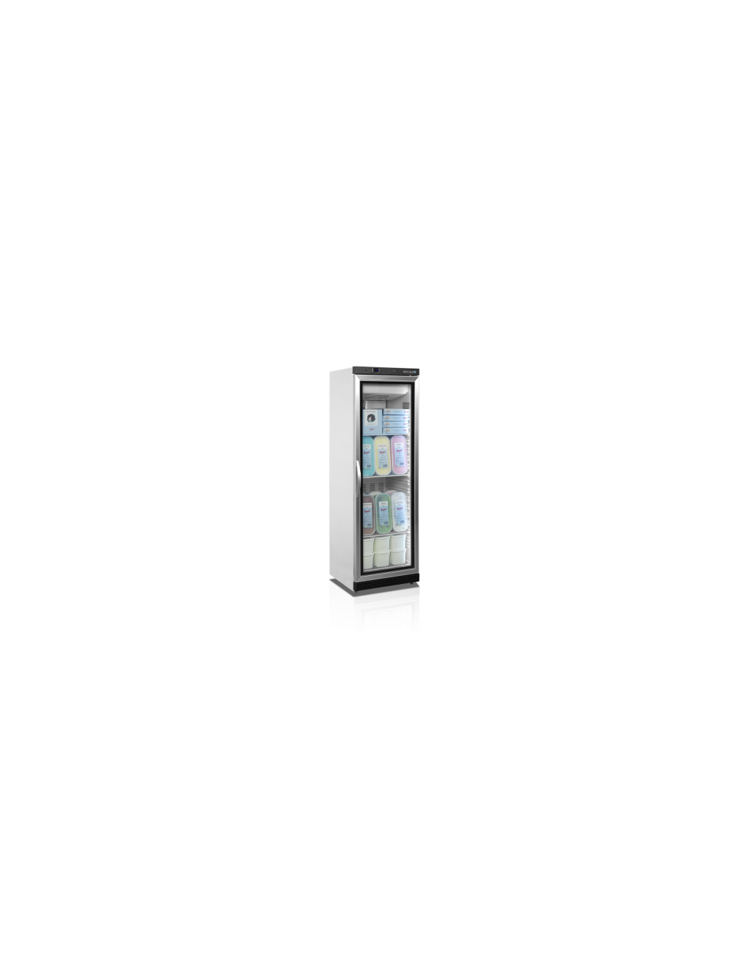 Armario Expositor de congelación con puerta de cristal, con triple acristalamiento calefactado y sistema de refrigeracion estatica Rango  de temperatura -24/-10ºC.