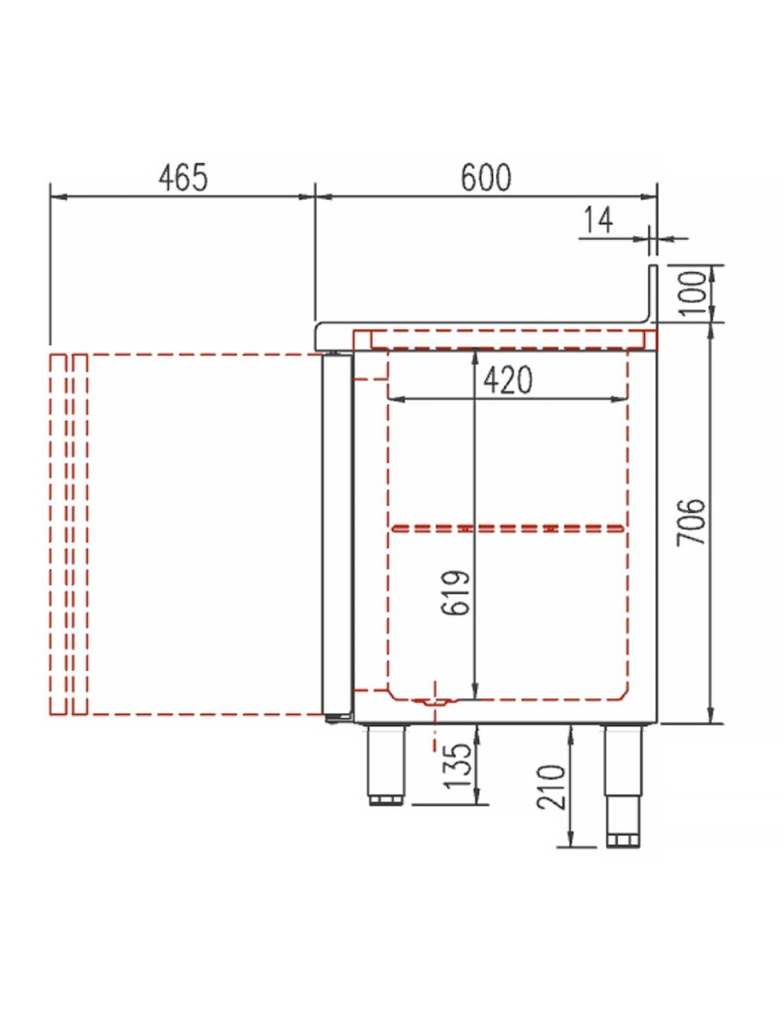 Cuenta con puertas opacas de apertura reversible, sistema de cierre automático, control digital de temperatura y un sistema de refrigeración ventilada que garantiza una temperatura homogénea. Su altura de 85 cm y la encimera con peto sanitario trasero de 10 cm la convierten en una solución ideal para líneas de preparación y servicio.