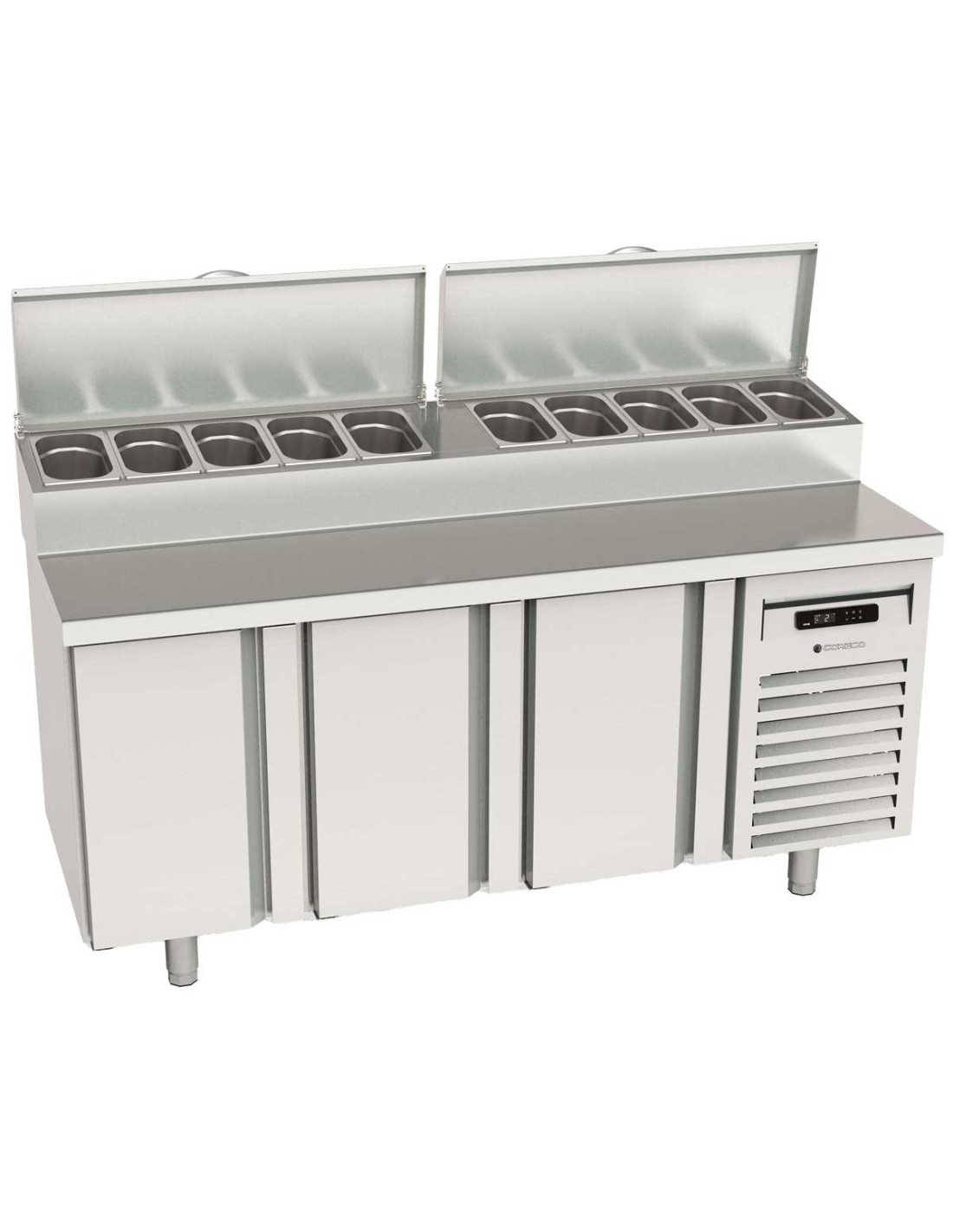 La mesa fría Salad-Chef Gama 700 MFEI70-180 de Coreco es una mesa de preparación refrigerada profesional, especialmente diseñada para la elaboración y conservación de alimentos fríos como ensaladas, ingredientes para pizzas, bocadillos y platos fríos. Ofrece una combinación óptima de robustez, ergonomía y eficiencia frigorífica, ideal para cocinas de alto rendimiento.