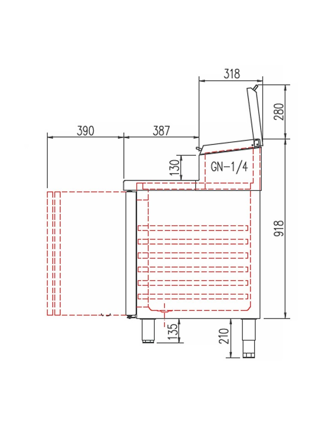 Expositor preparado para cubetas GN 1/4 de 150 mm de profundidad.