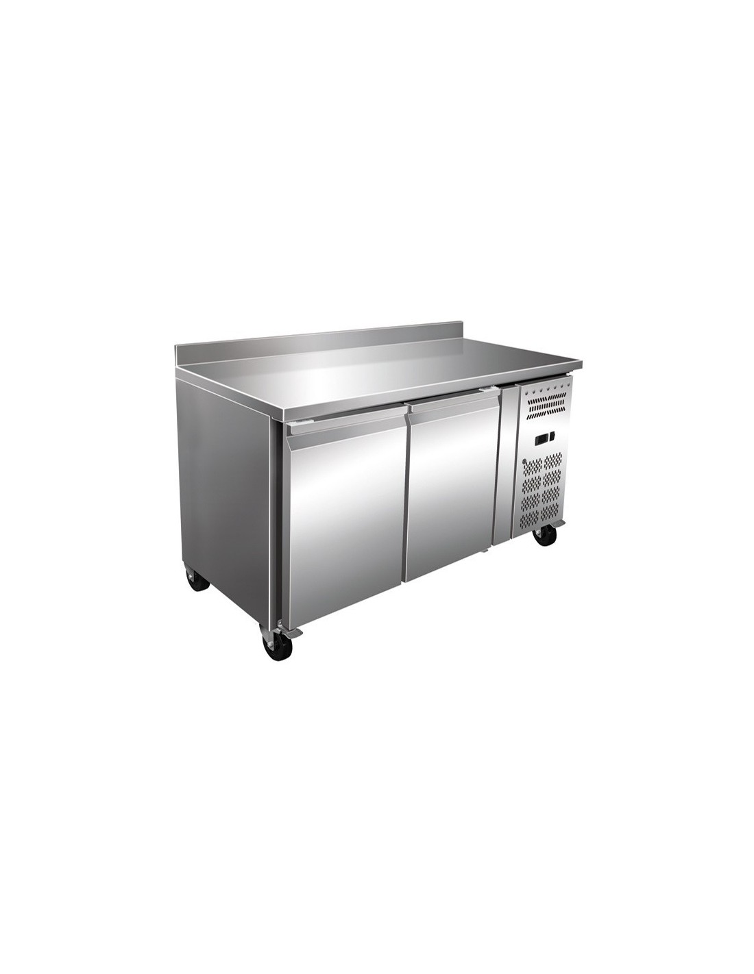 Mesa refrigerada de preparacion de acero inoxidable con Control electrónico de temperatura y desescarche automático. Tiene ruedas para facilitar su desplazamiento. Puertas con dispositivo automático de cierre y fijación de apertura que nos aporta ahorro de energía.