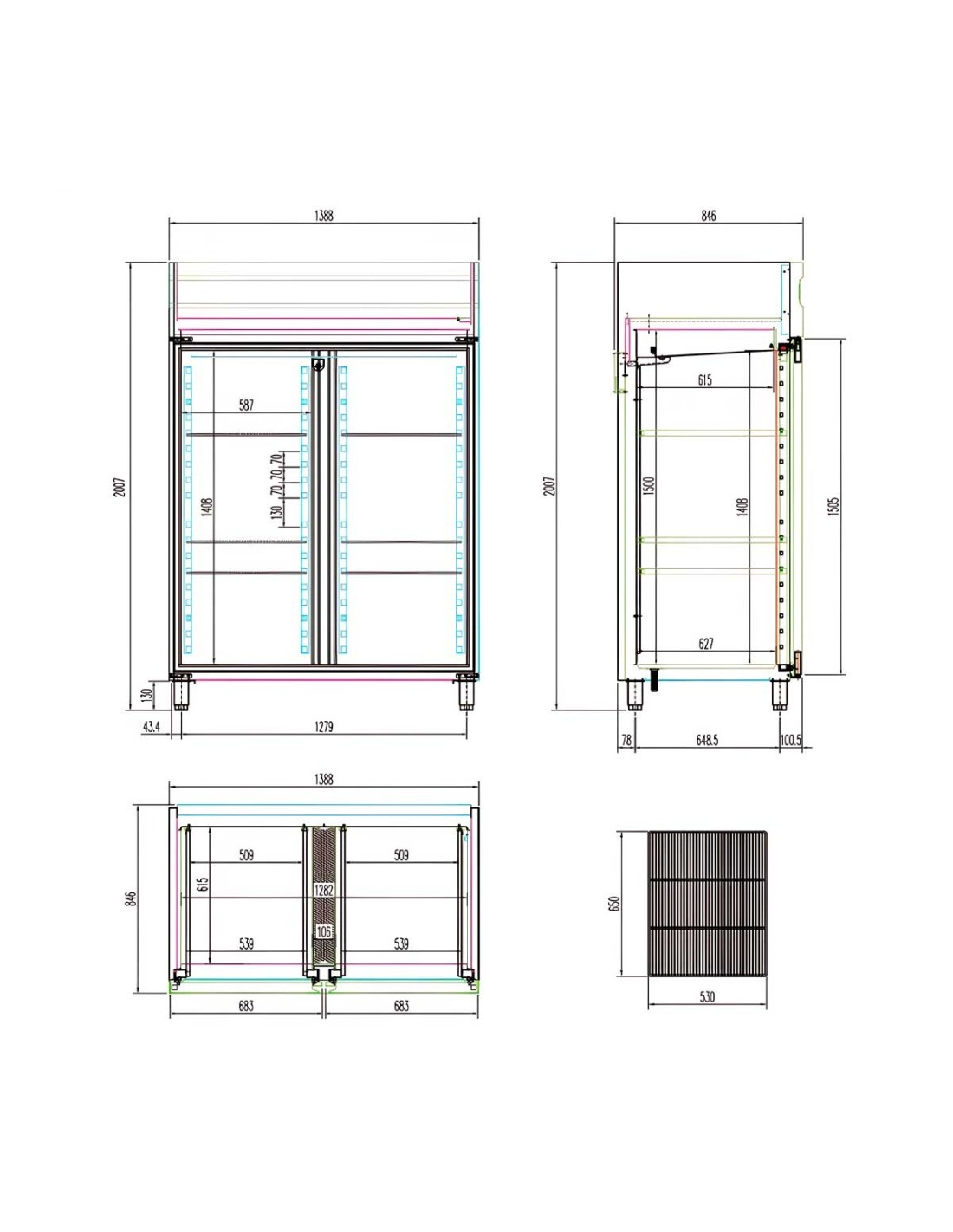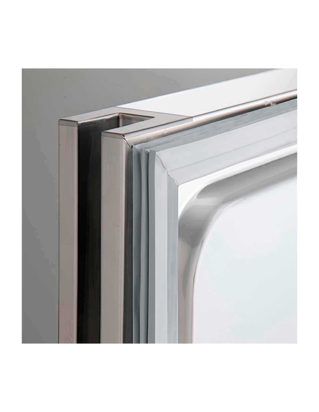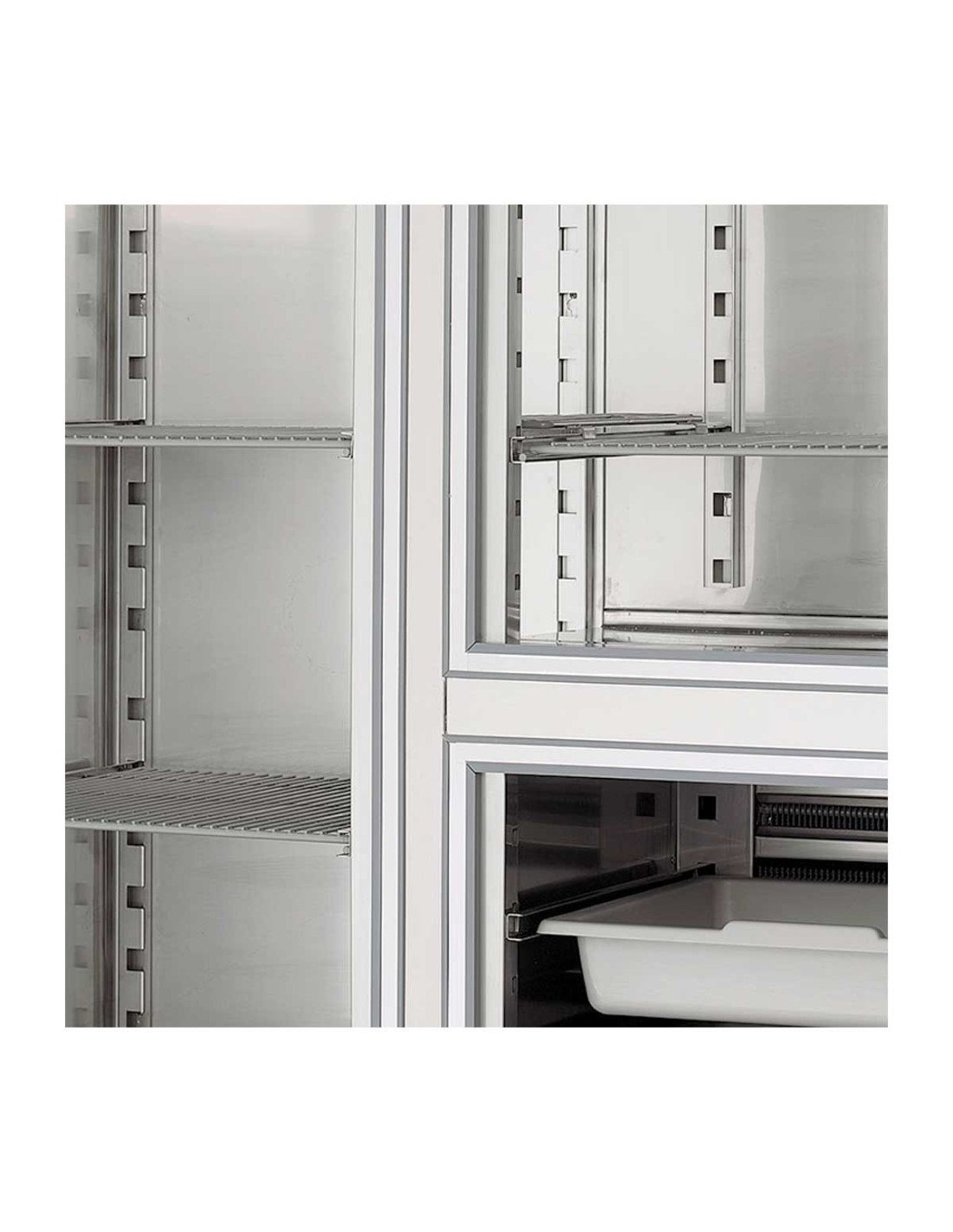 Pertenece a la serie GN 2/1 Inox y dispone de 2 puertas de cristal, 6 parrillas ajustables y un sistema de refrigeración eficiente con evaporador de tiro forzado, asegurando una temperatura uniforme en todo el interior. Su rango de temperatura ajustable de -2 °C a +8 °C permite conservar diferentes tipos de alimentos de manera óptima. La iluminación LED interior mejora la visibilidad de los productos, mientras que las puertas de cristal facilitan su exposición sin necesidad de abrirlas.