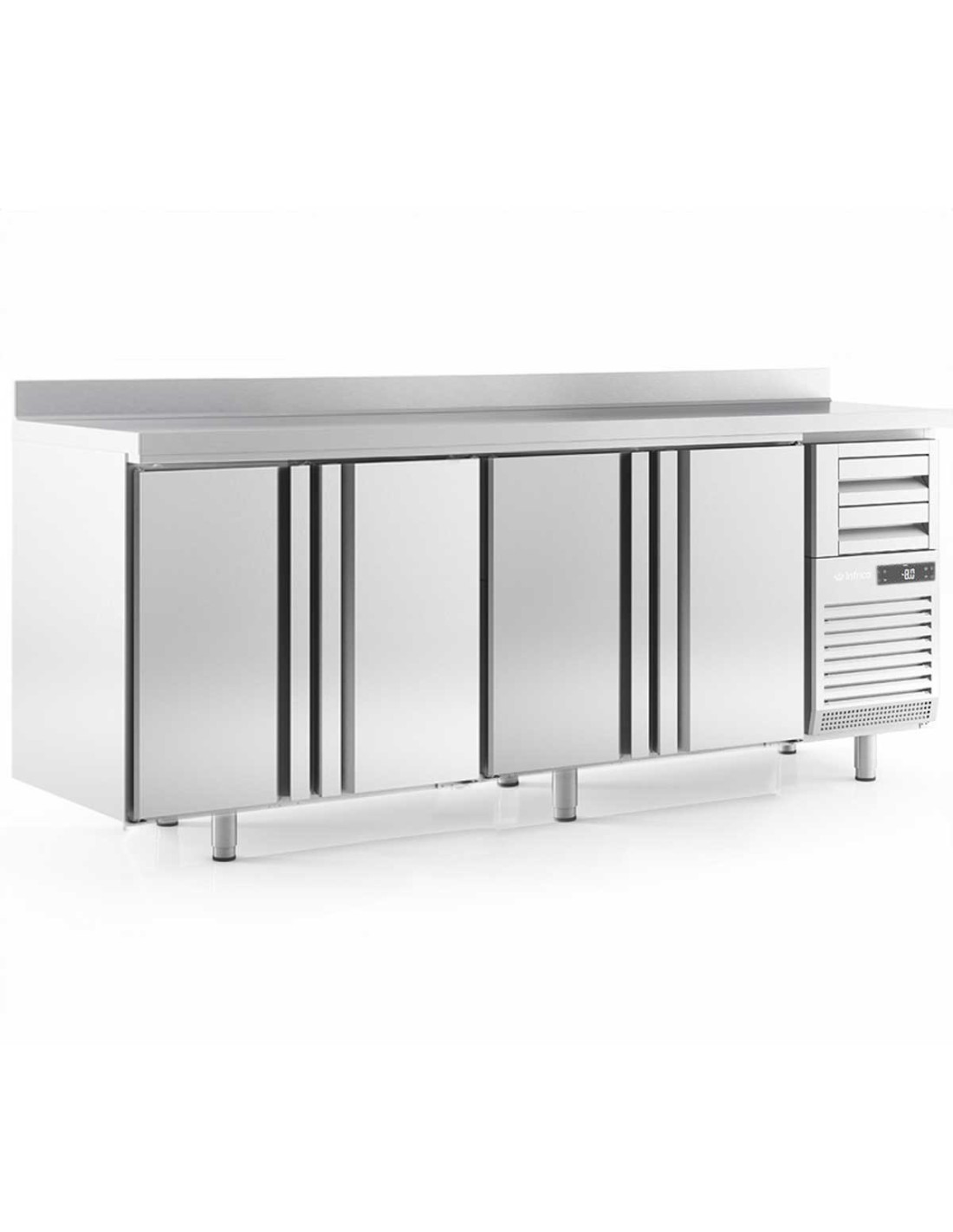 El Frente Mostrador Refrigerado FMPP 2500 II de Infrico está diseñado para la conservación eficiente de alimentos en entornos profesionales, con 4 puertas opacas y tiradores de doble agarre. Es ideal para restaurantes, cafeterías y bares que necesiten gran capacidad y acceso rápido.