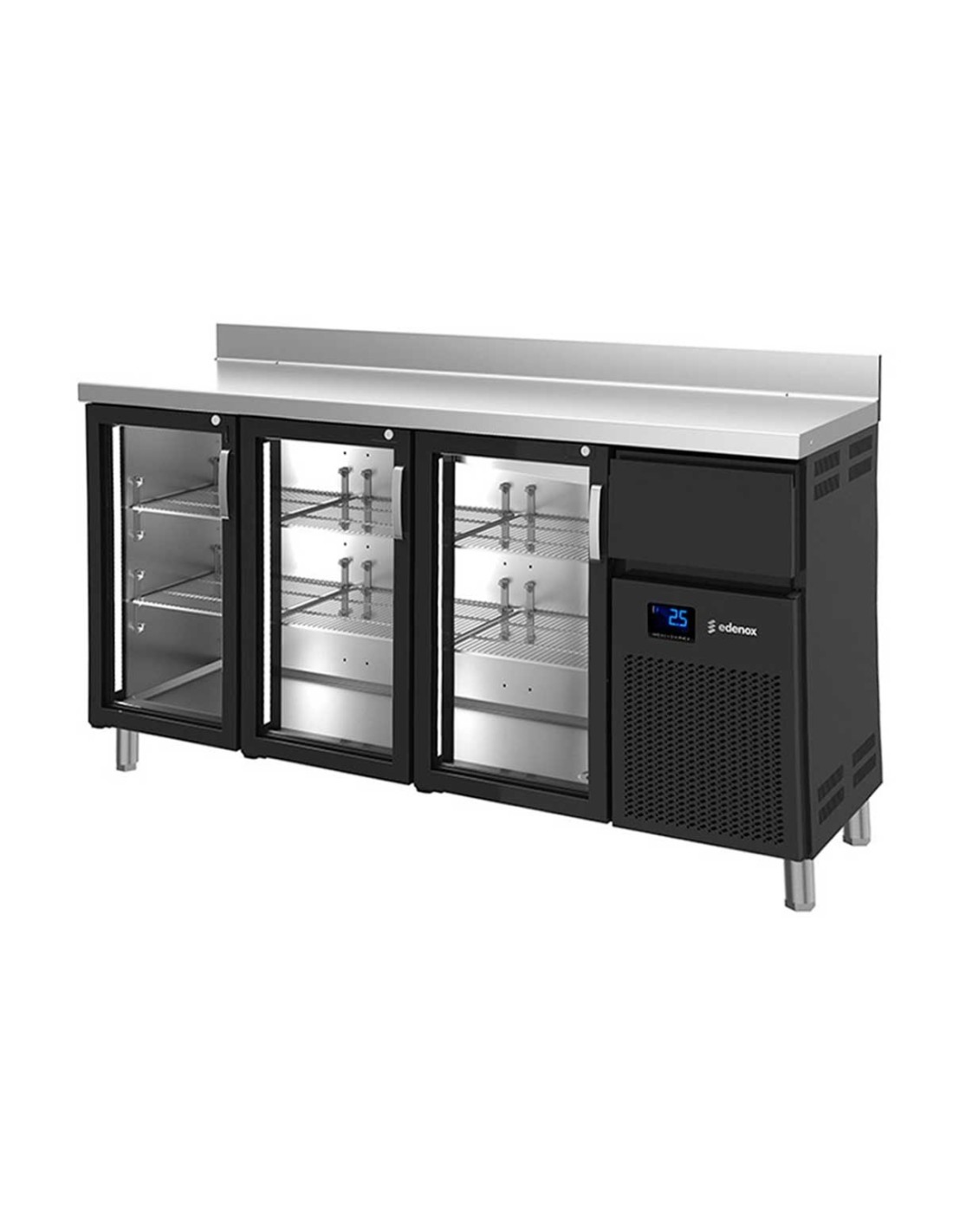 El modelo FMPS-200 HC PC Negra de Edenox dispone de 520 litros, 3 puertas de doble acristalamiento e iluminación interior. Su tecnología inverter optimiza el consumo y el sistema de ventilación frontal permite su instalación en espacios reducidos. Con un rango de trabajo de -2 °C a +8 °C, refrigerante R290 y potencia de 260 W, es una solución robusta y de alto rendimiento para negocios de hostelería.
