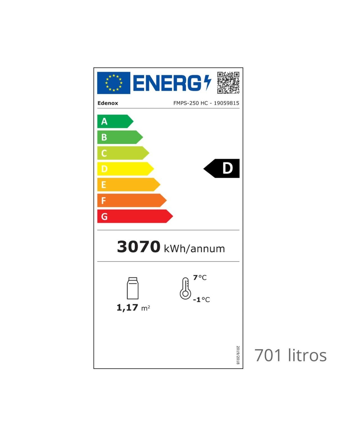 La mesa refrigerada FMPS-250 HC PC ofrece 701 litros de capacidad y 4 puertas de doble cristal con iluminación integrada. Incorpora tecnología inverter que reduce el consumo energético y sistema de aire frontal para un funcionamiento estable en zonas encajonadas. Funciona entre -2 °C y +8 °C, emplea refrigerante ecológico R290 y cuenta con una potencia de 340 W.
