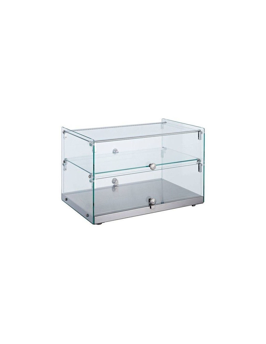 Vitrina expositora de sobremesa neutra, ideal para exponer bollería, bocadillos, sándwiches.Fabricada en cristal templado con perfilería en aluminio anodizado, con puertas abatibles.