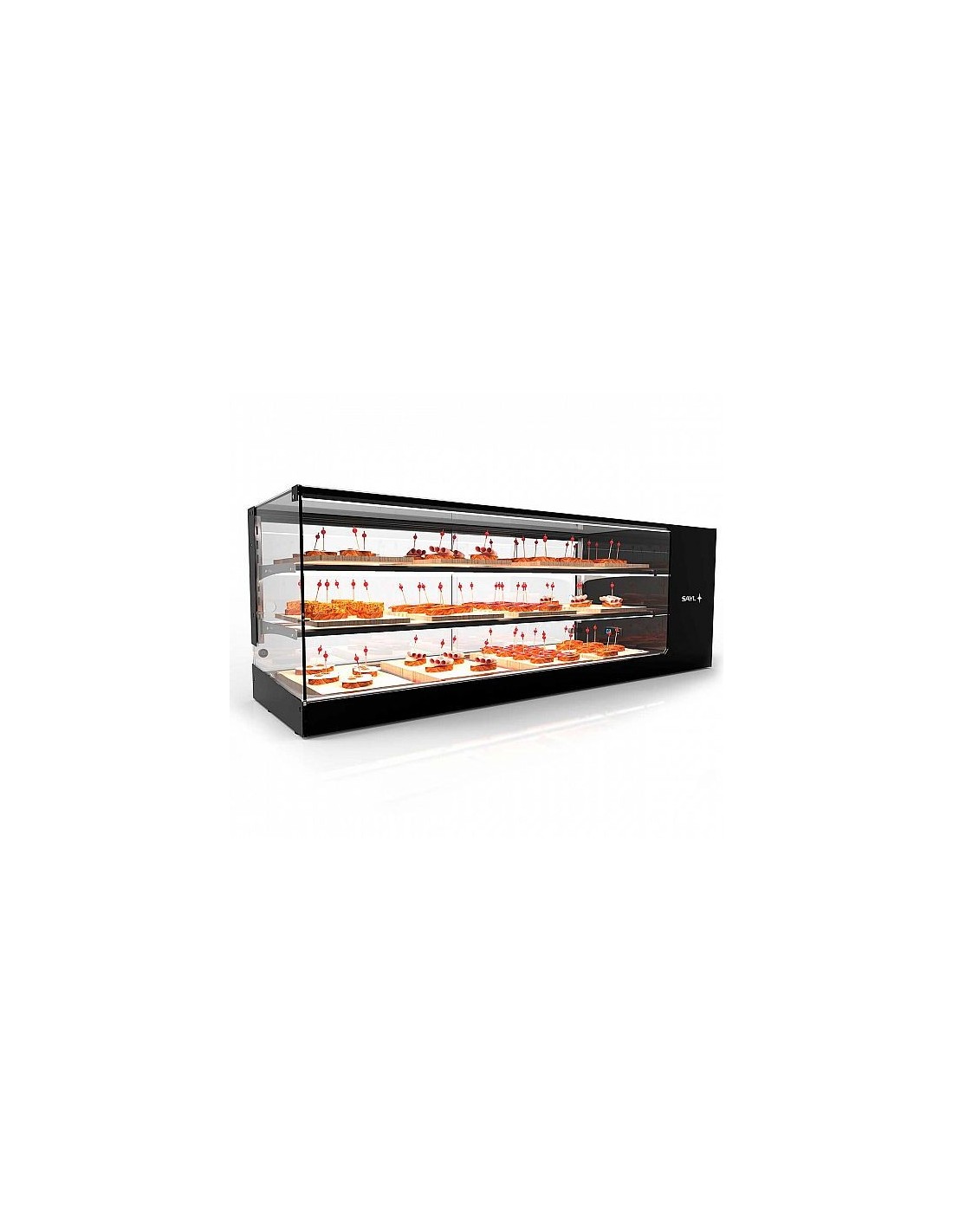 La Vitrina Refrigerada Sayl Logic 3 Pisos VTLG26P-2 Cuba Plana ofrece máxima visibilidad con cristal recto vitrificado, doble iluminación LED y tres niveles refrigerados a +2/+6 ºC. Incluye cuba embutida en acero inoxidable AISI 304, puertas correderas y dos estantes neutros regulables. Disponible en 97, 132 y 168 cm.