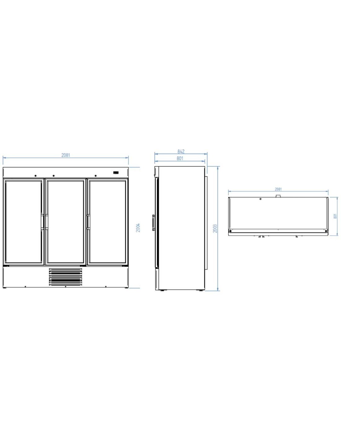 Expositor refrigerado vertical profesional de 2.030 litros, con iluminación LED de bajo consumo, refrigerante ecológico R-290 y temperatura de trabajo de +4 a +8 °C. Ideal para supermercados y tiendas de gran volumen.
