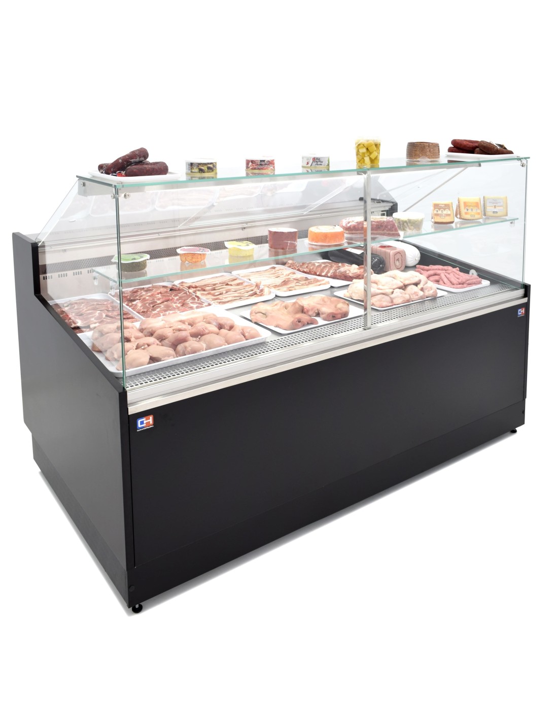 La vitrina incorpora vidrio templado panorámico recto con frontal abatible, encimera de trabajo en acero inoxidable y materiales de alta resistencia, lo que la convierte en una solución fiable para carnicerías, charcuterías, pescaderías y comercios de alimentación profesional.